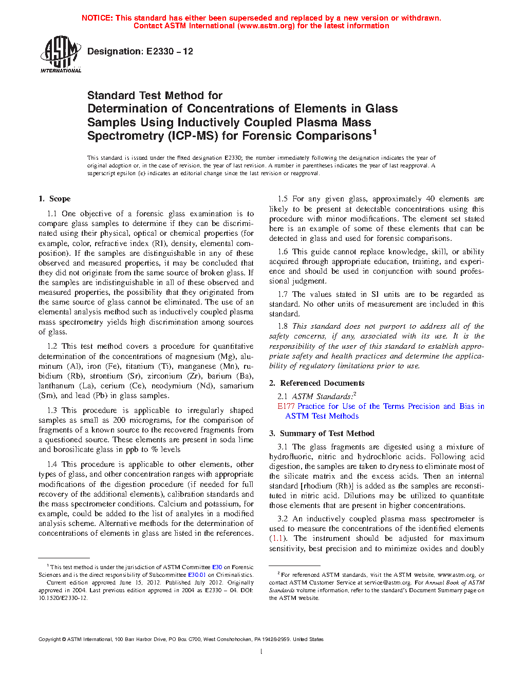 1.1 This test method covers a procedure for elemental analysis of magnesium (Mg), aluminum (Al, titanium (Ti), manganese (Mn), gallium (Ga), rubidium (Rb), strontium (Sr), zirconium (Zr), antimony (Sb), barium (Ba), lanthanum (La), cerium (Ce), samarium (Sm), hafnium (Hf) and lead (Pb) in the bulk of glass samples (irregularly shaped and as small as 200 micrograms) for the comparison of fragments of a known source to the recovered fragments from a questioned source. These elements are present in soda lime and borosilicate glass in ngg-1 to % levels. Alternative methods for the determination of elemental analysis of glass are listed in the references. This procedure may also be applicable to other elements, other types of glass, or other concentration ranges with appropriate modifications of the digestion procedure (if needed for full recovery of the additional elements) and the mass spectrometer conditions. The addition of calcium and potassium, for example, could be added to the list of analytes in a modified analysis scheme.