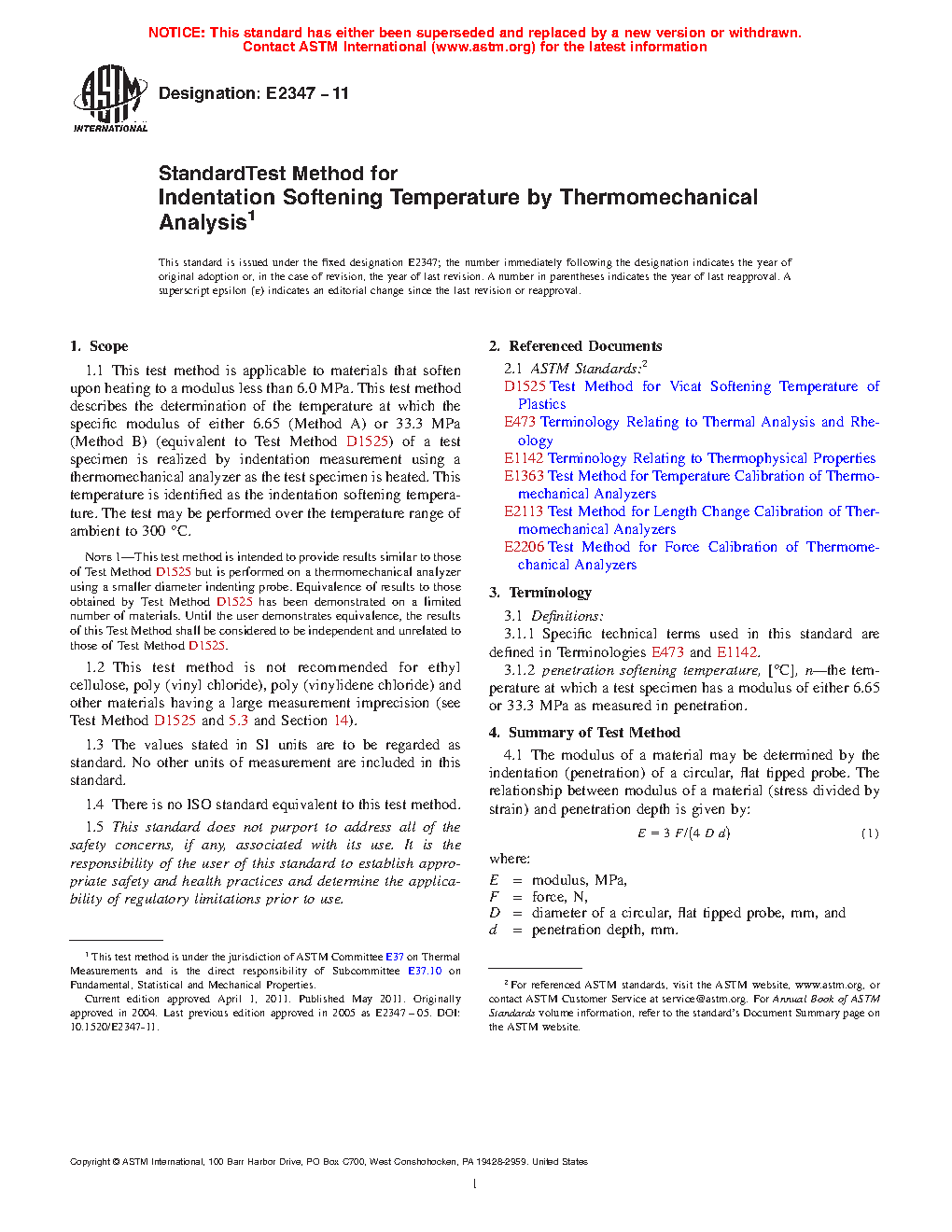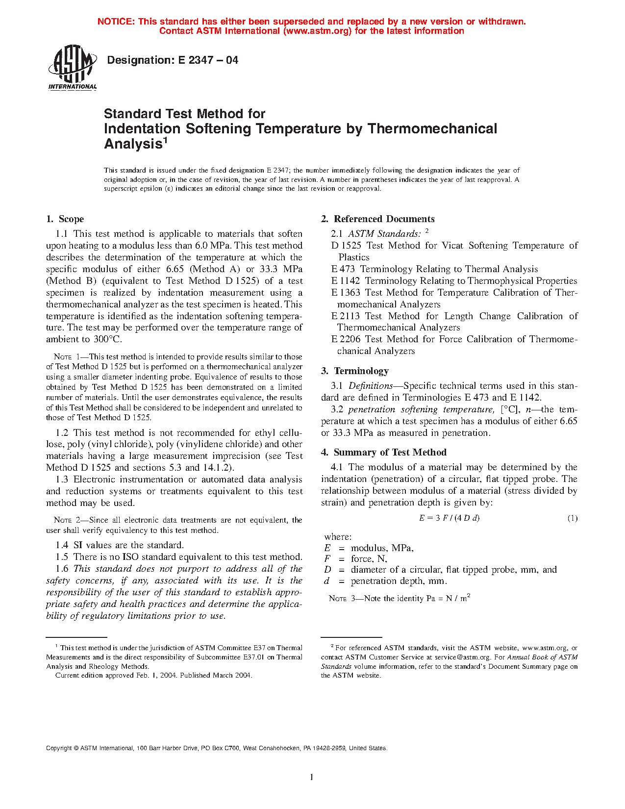 1.1 This test method is applicable to materials that soften upon heating to a modulus less than 6.0 MPa. This test method describes the determination of the temperature at which the specific modulus of either 6.65 (Method A) or 33.3 MPa (Method B) (equivalent to Test Method D 1525) of a test specimen is realized by indentation measurement using a thermomechanical analyzer as the test specimen is heated. This temperature is identified as the indentation softening temperature. The test may be performed over the temperature range of ambient to 300C.