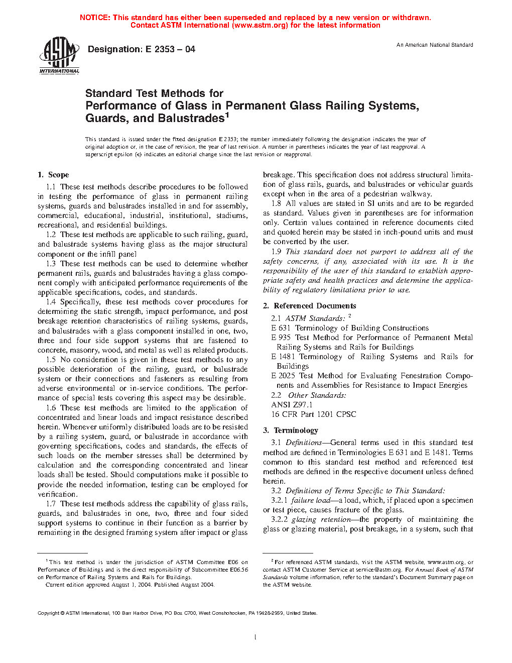 1.1 These test methods cover procedures to be followed in testing the performance of glazing in permanent railing systems, guards and balustrades including components such as rails and swing gates or other forms of required guardrail opening protection installed in and for assembly, commercial, educational, industrial, institutional, stadiums, recreational, and residential buildings and other structures such as towers or elevated platforms.