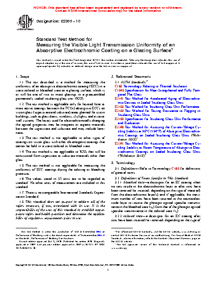 1.1 The test described is a method for measuring the uniformity of an absorptive electrochromic coating (ECC) in a static colored or bleached state on a glazing surface, which is or will be one of two or more glazings in a preassembled permanently sealed insulating glass unit (IGU).