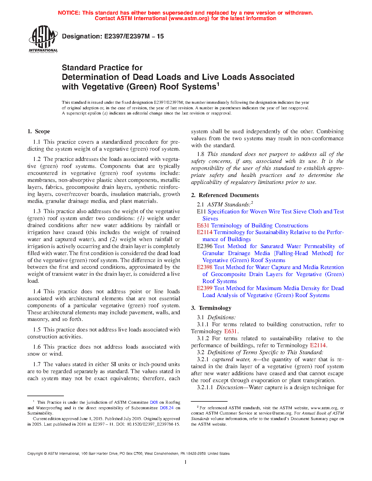 5.1 This practice addresses performance characteristics for vegetative (green) roof systems with respect to the dead load and transient water load of the entire vegetative (green) roof system.