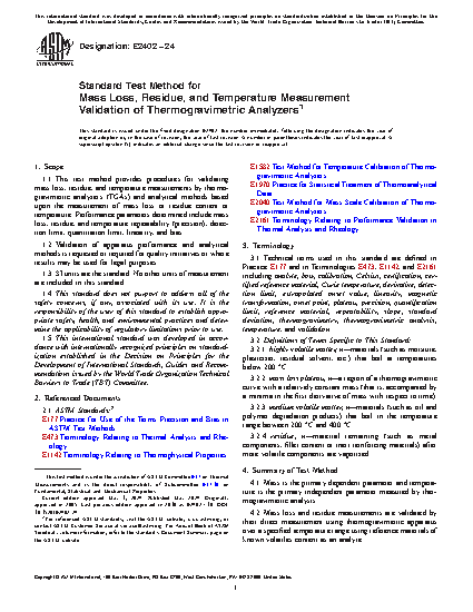 1.1 This test method provides procedures for validating mass loss and residue measurements by thermogravimetric analyzers (TGA) and analytical methods based upon the measurement of mass loss or residue content. Performance parameters determined include mass loss and residue repeatability (precision), detection limit, quantitation limit, linearity, and bias.