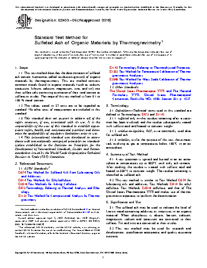 1.1 This test method describes the determination of sulfated ash content (sometimes called residue-on-ignition) of organic materials by thermogravimetry. This test method converts common metals found in organic materials (such as sodium, potassium, lithium, calcium, magnesium, zinc, and tin) into their sulfate salts permitting estimation of their total content as sulfates or oxides. The range of this test method is from 0.1 % to 100 % metal content.