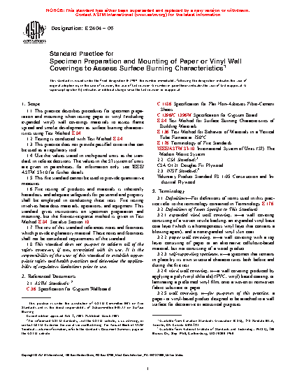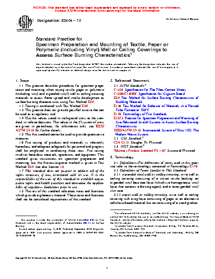 1.1 This practice describes procedures for specimen preparation and mounting when testing textile, paper, vinyl, expanded vinyl, or other polymeric wall or ceiling covering materials to assess flame spread and smoke development as surface burning characteristics using Test Method E84.