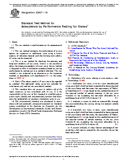 1.3 This is a test method for checking the accuracy and long-term reliability of test sieves. Since it is not possible to adjust the measuring capability of a test sieve, the test method is designed to offer a verification procedure based on sieving performance by comparison to a standard reference. This test method is not proposed as an alternative to the inspection methods in accordance with Specification E11 or the procedures in MNL 32.