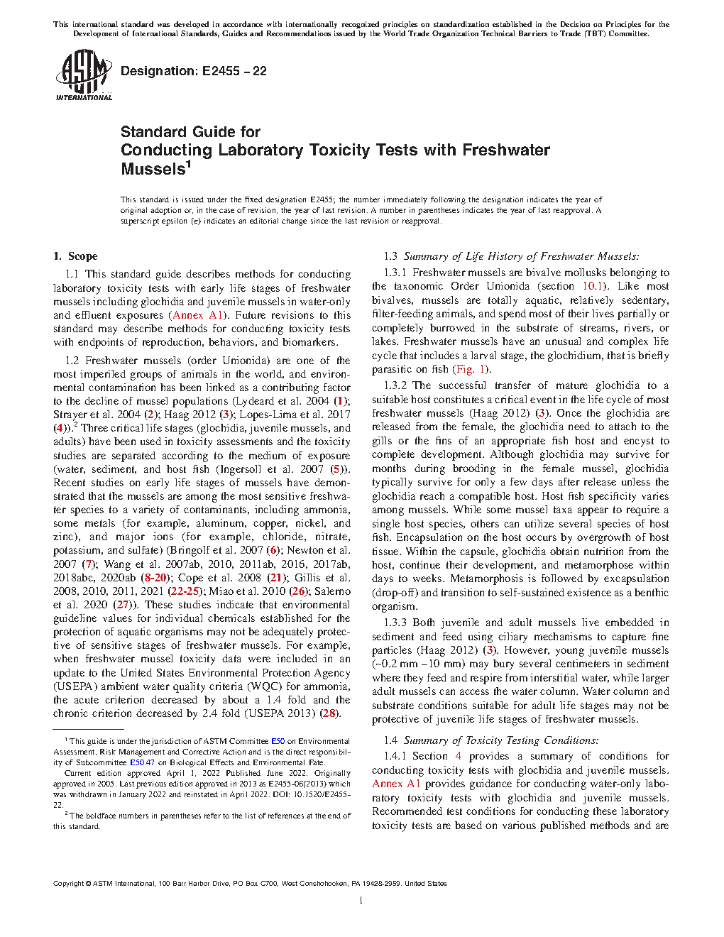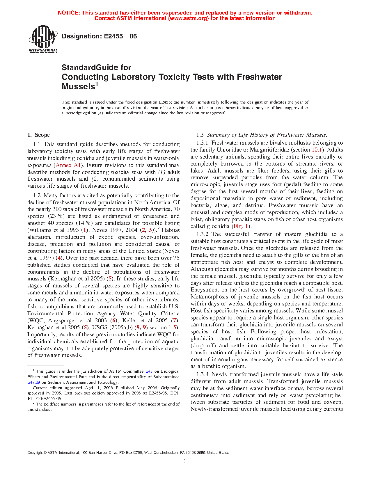 1.1 This standard guide describes methods for conducting laboratory toxicity tests with early life stages of freshwater mussels including glochidia and juvenile mussels in water-only exposures (Annex A1). Future revisions to this standard may describe methods for conducting toxicity tests with (1) adult freshwater mussels and (2) contaminated sediments using various life stages of freshwater mussels.