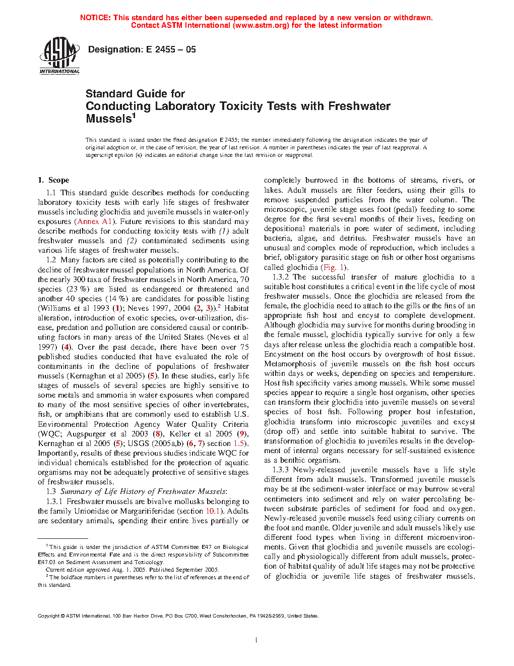 5.4 Results of toxicity tests conducted with mussels might be an important consideration when assessing the risks of test materials to aquatic organisms or when deriving USEPA Water Quality Criteria for aquatic organisms (Guide E1241).