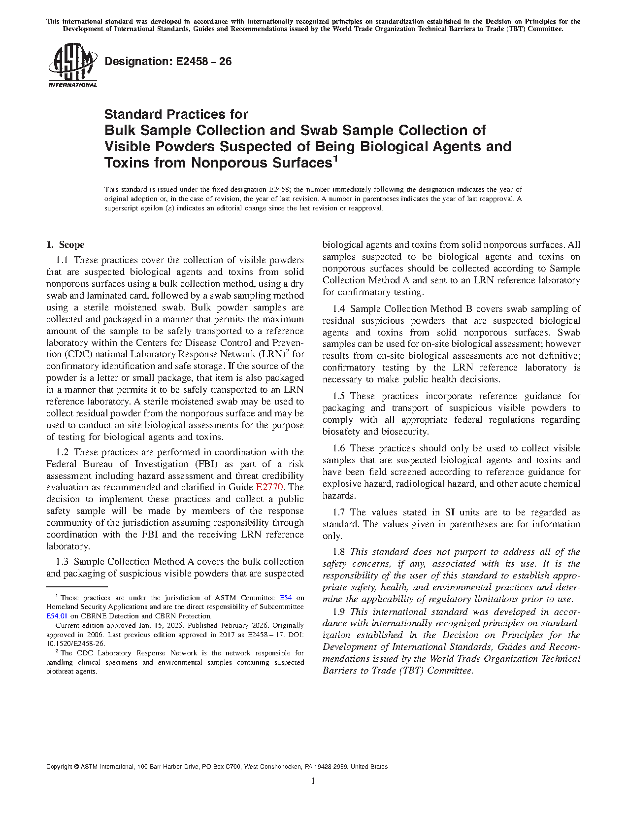 1.1 These practices address collection of visible powders that are suspected biothreat agents from solid nonporous surfaces using a bulk collection method, using a dry swab and laminated card, followed by a swab sampling method using a sterile moistened swab. Bulk powder samples are collected and packaged in a manner that permits the maximum amount of the sample to be safely transported to a reference laboratory within the Centers for Disease Control and Prevention (CDC) national Laboratory Response Network (LRN) for confirmatory identification and safe storage. If the source of the powder is a letter or small package, that item is also packaged in a manner that permits it to be safely transported to an LRN reference laboratory. A sterile moistened swab may be used to collect residual powder and may be used to conduct on-site biological assessments for the purpose of testing for biothreat agents.