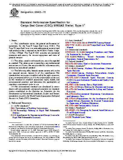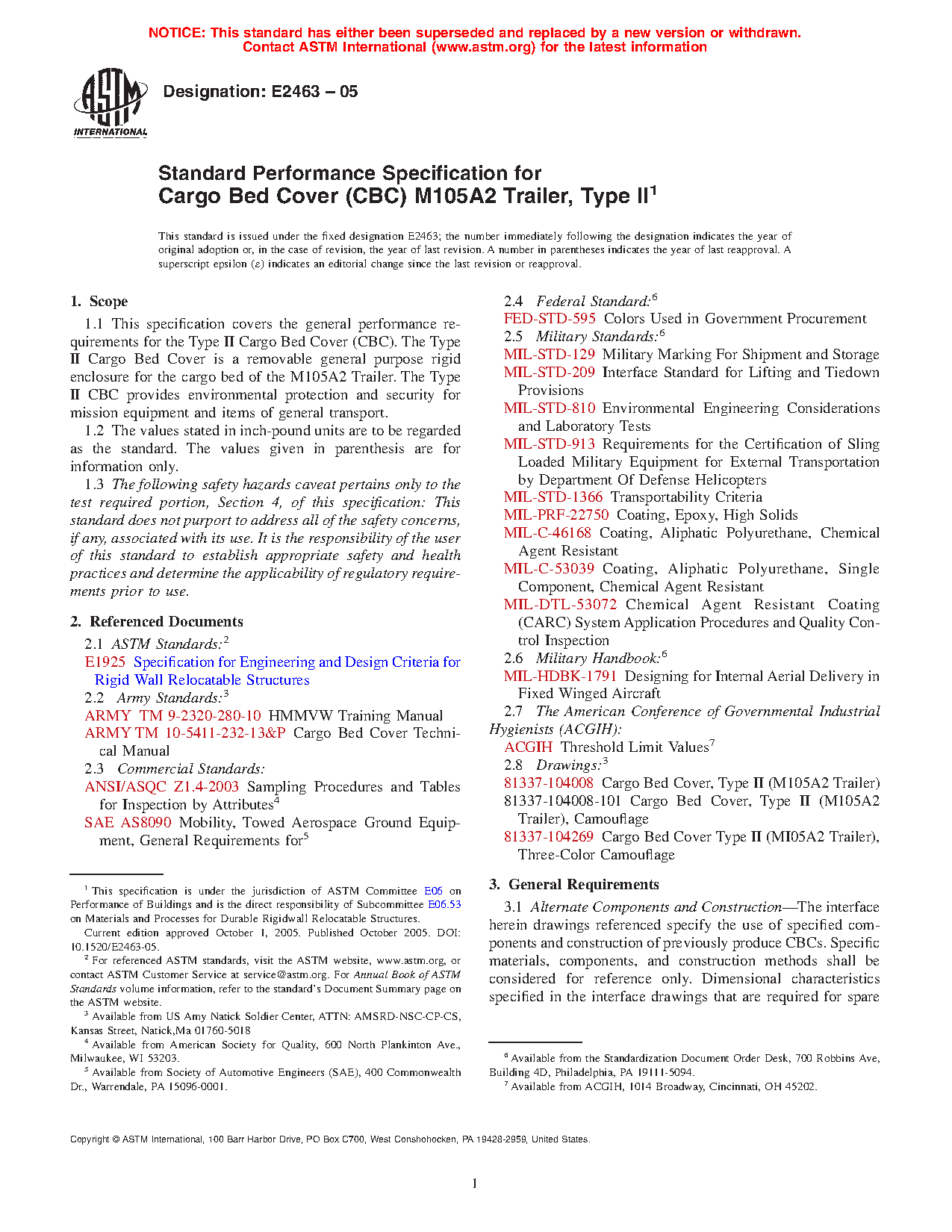 1.1 This specification covers the general performance requirements for the Type II Cargo Bed Cover (CBC). The Type II Cargo Bed Cover is a removable general purpose rigid wall enclosure that is mounted on the M105A2 Trailer, Cargo: 1.5 Ton, 2 Wheel. The Type II CBC provides environmental protection and security for mission equipment and items of general transport.