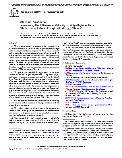 1.2 The practice is intended for application to the outer surfaces of the wall of polyethylene tanks. Degradation typically occurs in an outer layer approximately 3.2-mm [0.125-in.] thick. Since the technique does not interrogate the inside wall of the tank, wall thickness is not a consideration other than to be aware of possible guided (Lamb) wave effects or reflections off of the inner tank wall. No special surface preparation is necessary beyond wiping the area with a clean rag. Inside wall properties are not important since the longitudinal wave does not strike this surface. The excitation of Lamb waves must be avoided by choosing an excitation frequency such that the ratio of wavelength to wall thickness is one fifth or less.