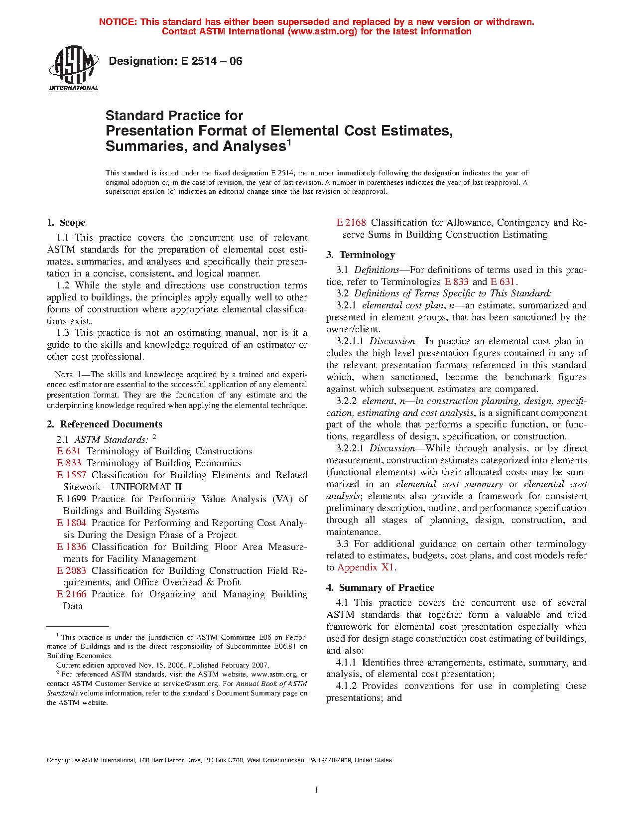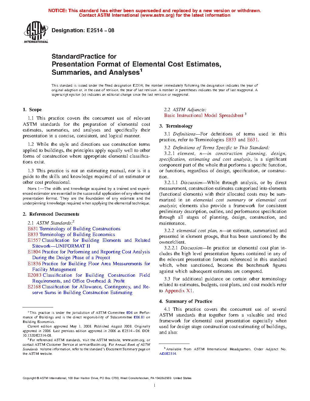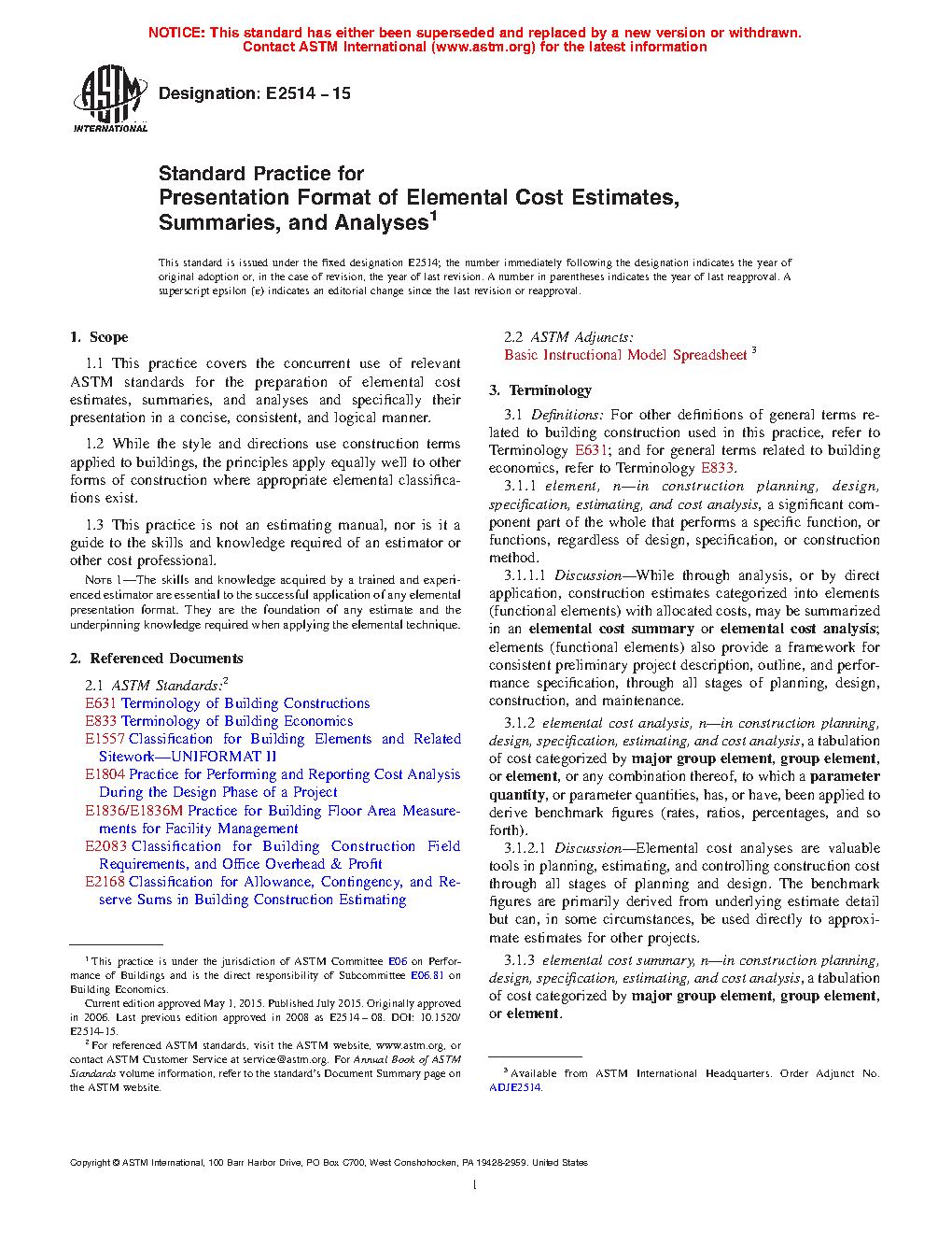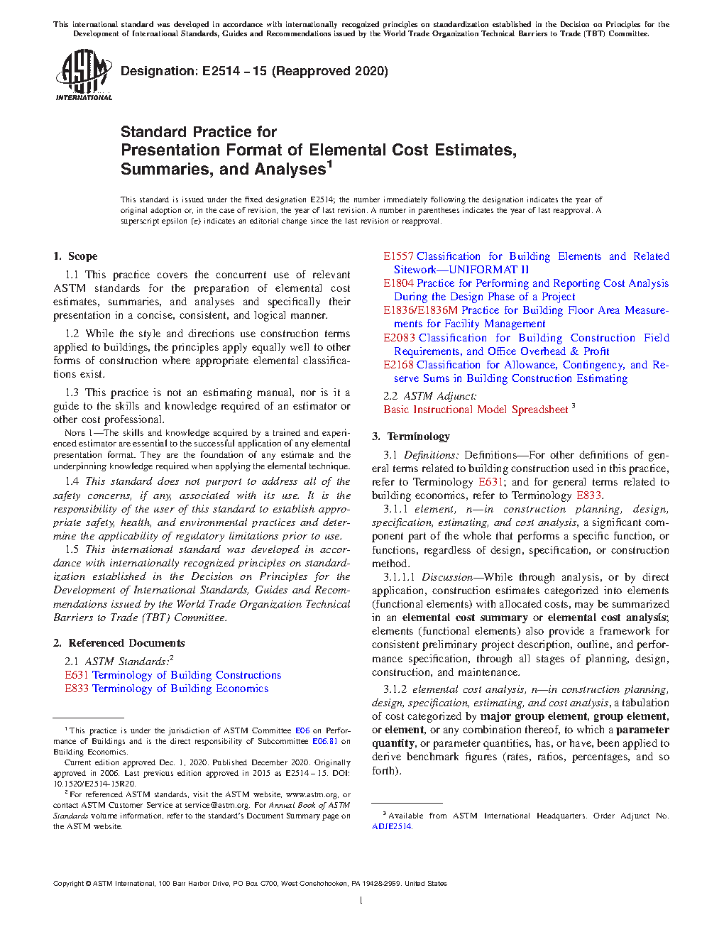1.1 This practice covers the concurrent use of relevant ASTM standards for the preparation of elemental cost estimates, summaries, and analyses and specifically their presentation in a concise, consistent, and logical manner.