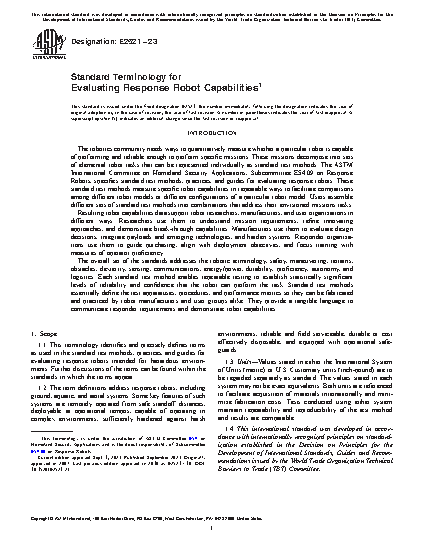1.1 This terminology identifies and precisely defines terms as used in the standard test methods, practices, and guides for evaluating response robots intended for hazardous environments. Further discussions of the terms can be found within the standards in which the terms appear.