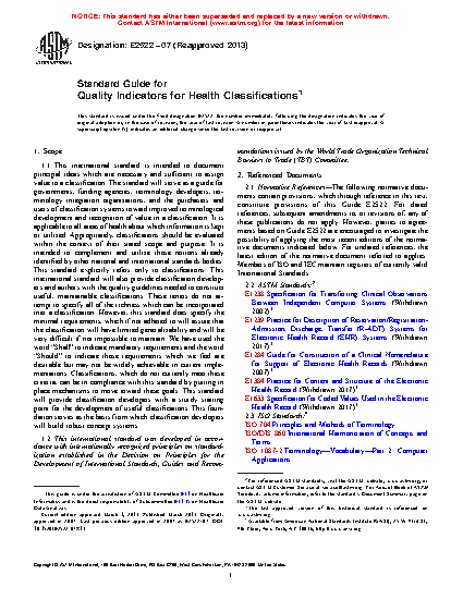 1.1 This international standard is intended to document principal ideas which are necessary and sufficient to assign value to a classification. The standard will serve as a guide for governments, funding agencies, terminology developers, terminology integration organizations, and the purchasers and users of classification systems toward improved terminological development and recognition of value in a classification. It is applicable to all areas of health about which information is kept or utilized. Appropriately, classifications should be evaluated within the context of their stated scope and purpose. It is intended to complement and utilize those notions already identified by other national and international standards bodies. This standard explicitly refers only to classifications. This international standard will also provide classification developers and authors with the quality guidelines needed to construct useful, maintainable classifications. These tenets do not attempt to specify all of the richness which can be incorporated into a classification. However, this standard does specify the minimal requirements, which if not adhered to will assure that the classification will have limited generalizability and will be very difficult if not impossible to maintain. We have used the word "Shall" to indicate mandatory requirements and the word "Should" to indicate those requirements which we feel are desirable but may not be widely achievable in current implementations. Classifications, which do not currently meet these criteria, can be in compliance with this standard by putting in place mechanisms to move toward these goals. This standard will provide classification developers with a sturdy starting point for the development of useful classifications. This foundation serves as the basis from which classification developers will build robust concept systems.