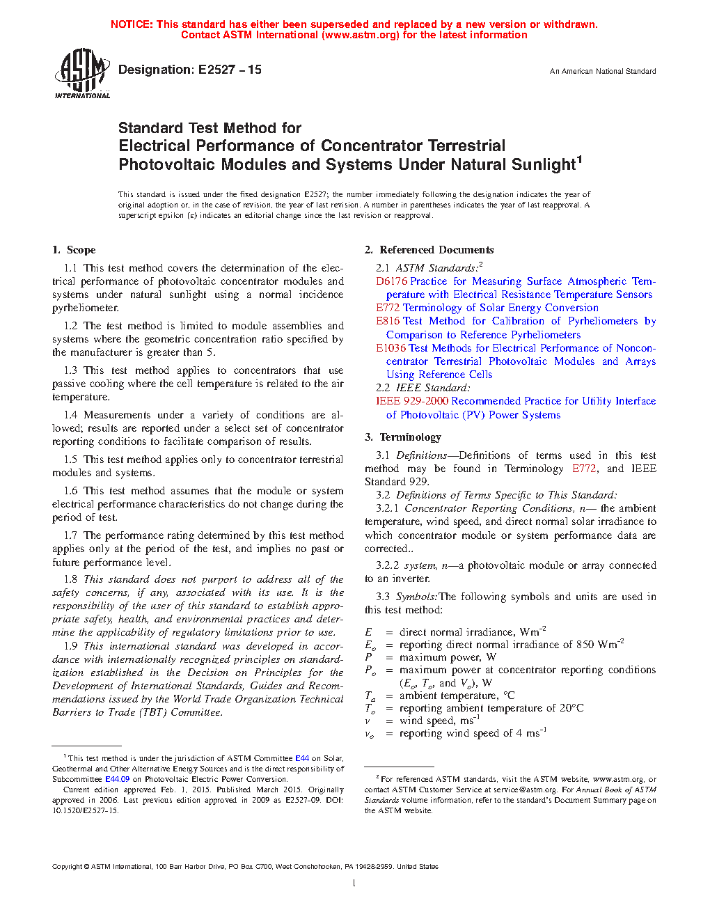 1.1 This test method covers the determination of the electrical performance of photovoltaic concentrator modules and systems under natural sunlight using a normal incidence pyrheliometer.
