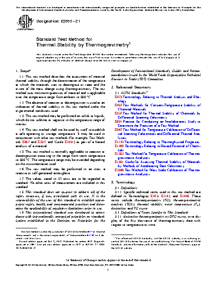 1.1 This test method describes the assessment of material thermal stability through the determination of the temperature at which the materials start to decompose or react and the extent of the mass change using thermogravimetry. The test method uses minimum quantities of material and is applicable over the temperature range from ambient to 800°C.