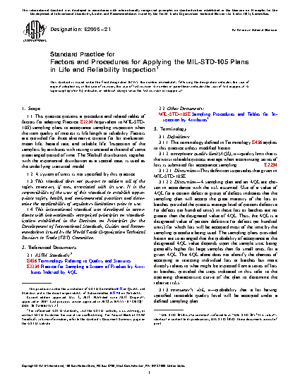 1.1 This practice presents a procedure and related tables of factors for adapting Practice E2234 (equivalent to MIL-STD-105) sampling plans to acceptance sampling inspection when the item quality of interest is life length or reliability. Factors are provided for three alternative criteria for lot evaluation: mean life, hazard rate, and reliable life. Inspection of the sample is by attributes with testing truncated at the end of some prearranged period of time. The Weibull distribution, together with the exponential distribution as a special case, is used as the underlying statistical model.