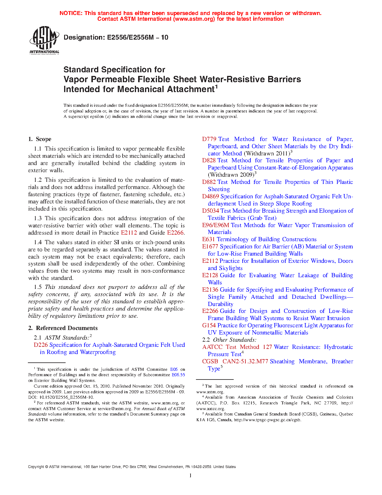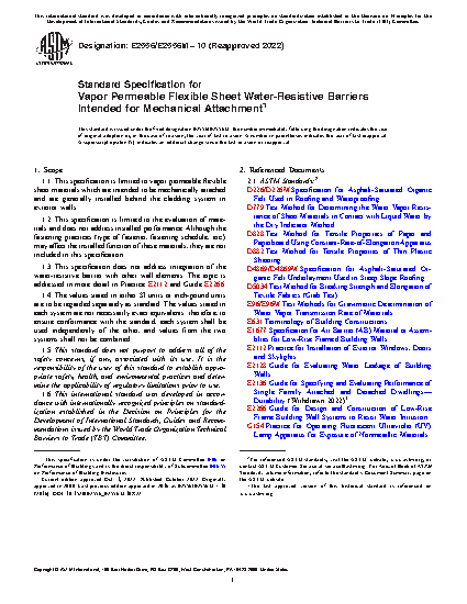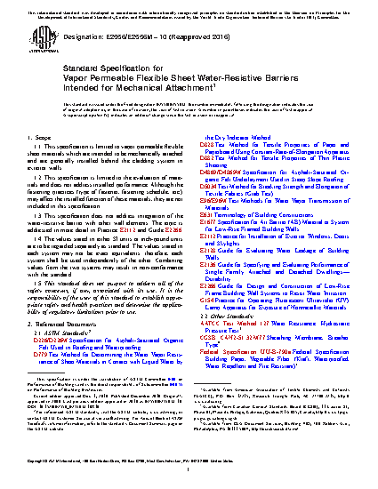 1.1 This specification is limited to vapor permeable flexible sheet materials which are intended to be mechanically attached and are generally installed behind the cladding system in exterior walls.