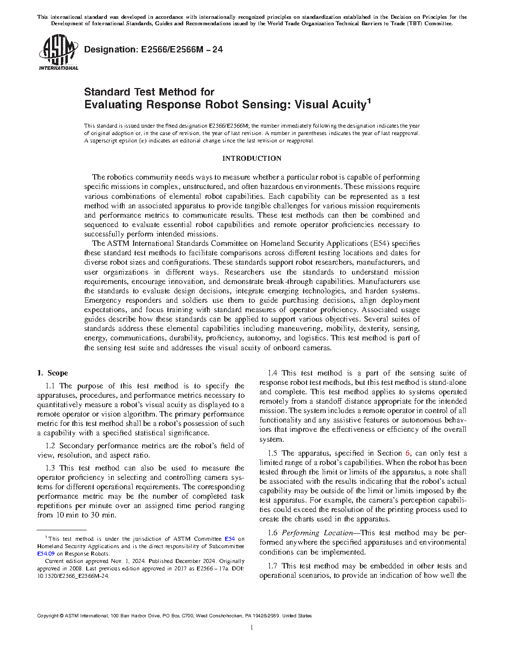 1.1 The purpose of this test method is to specify the apparatuses, procedures, and performance metrics necessary to quantitatively measure a robot’s visual acuity as displayed to a remote operator or vision algorithm. The primary performance metric for this test method shall be a robot’s possession of such a capability with a specified statistical significance.
