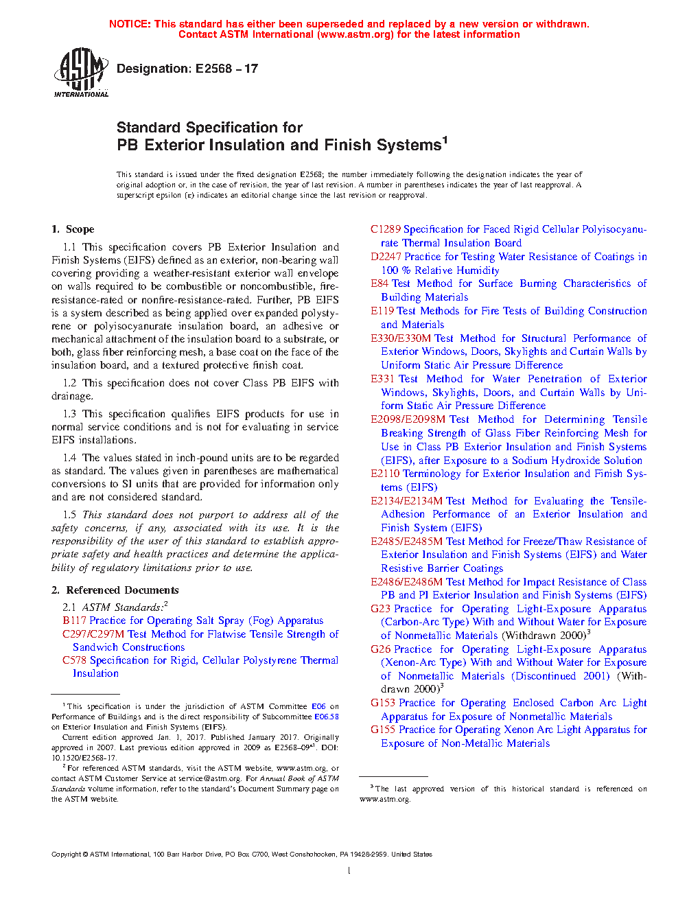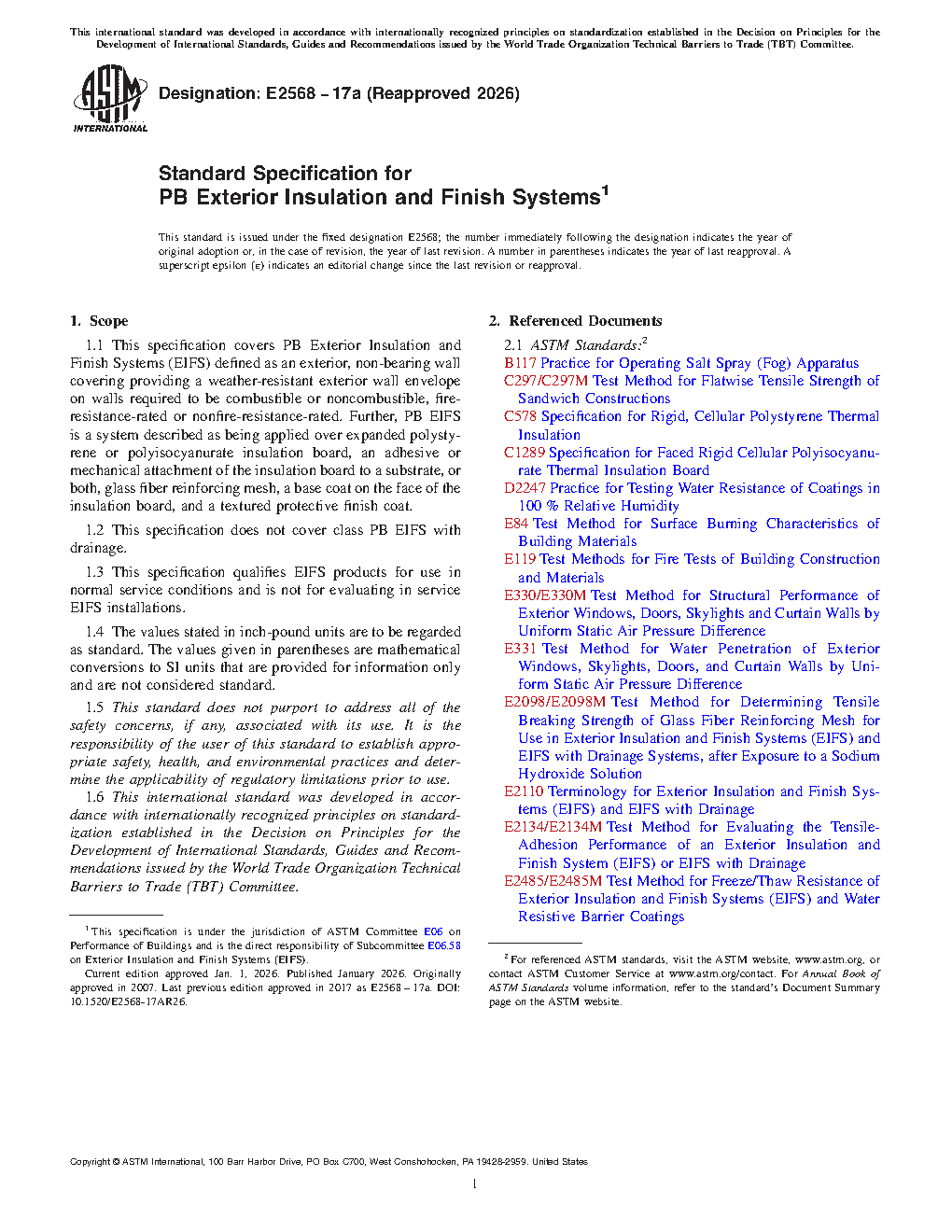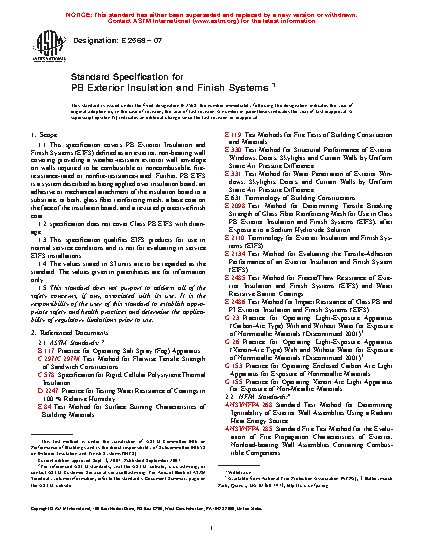 This specification covers PB Exterior Insulation and Finish Systems (EIFS) defined as an exterior, non-bearing wall covering providing a weather-resistant exterior wall envelope on walls required to be combustible or noncombustible, fireresistance-rated or nonfire-resistance-rated. Further, PB EIFS is a system described as being applied over insulation board, an adhesive or mechanical attachment of the insulation board to a substrate, or both, glass fiber reinforcing mesh, a base coat on the face of the insulation board, and a textured protective finish coat. The following tests shall be performed in accordance to the following test methods” accelerated weathering; freeze/thaw; salt spray resistance; tensile bond adhesion; water penetration; water resistance; physical properties and requirements for EPS; alkali resistance of reinforcing mesh; fire endurance; full-scale multi-story fire test; and ignition resistance.