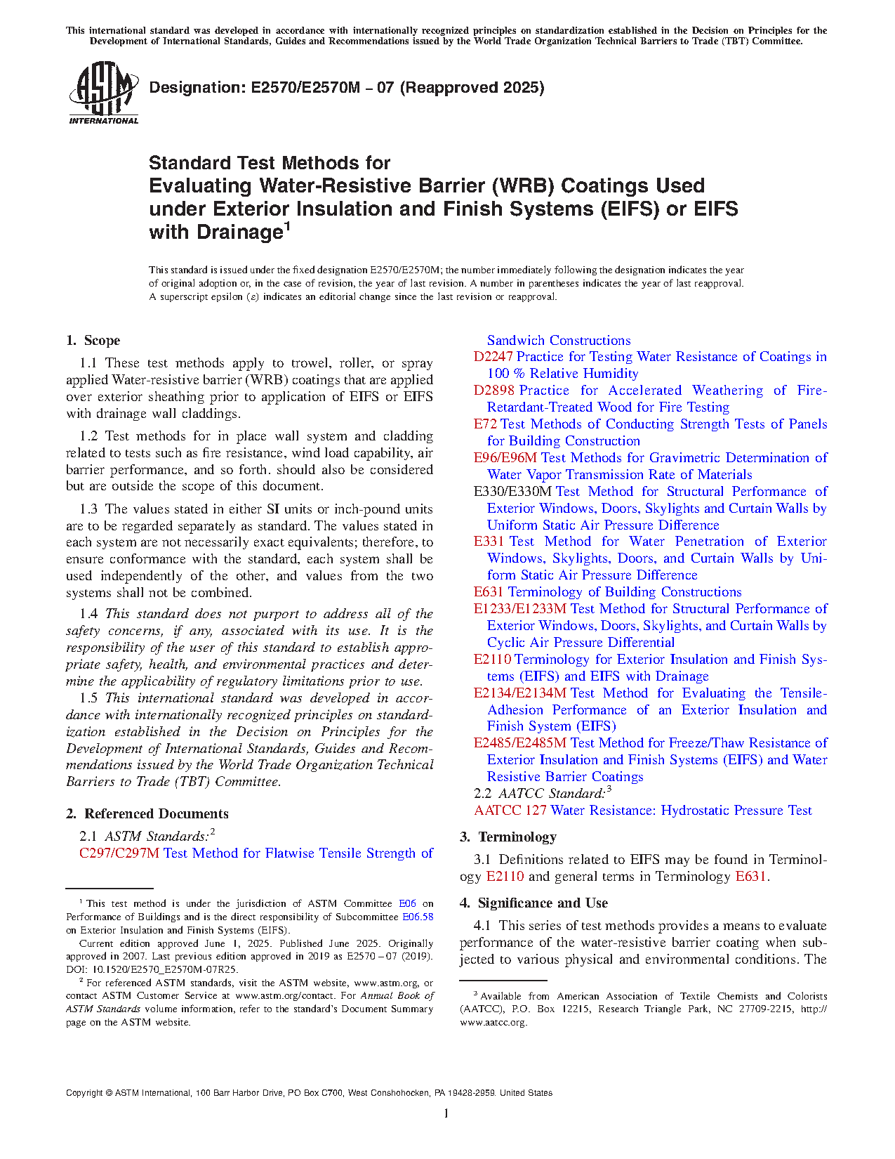 1.1 These test methods apply to trowel, roller, or spray applied Water-resistive barrier (WRB) coatings that are applied over exterior sheathing prior to application of EIFS or EIFS with drainage wall claddings.