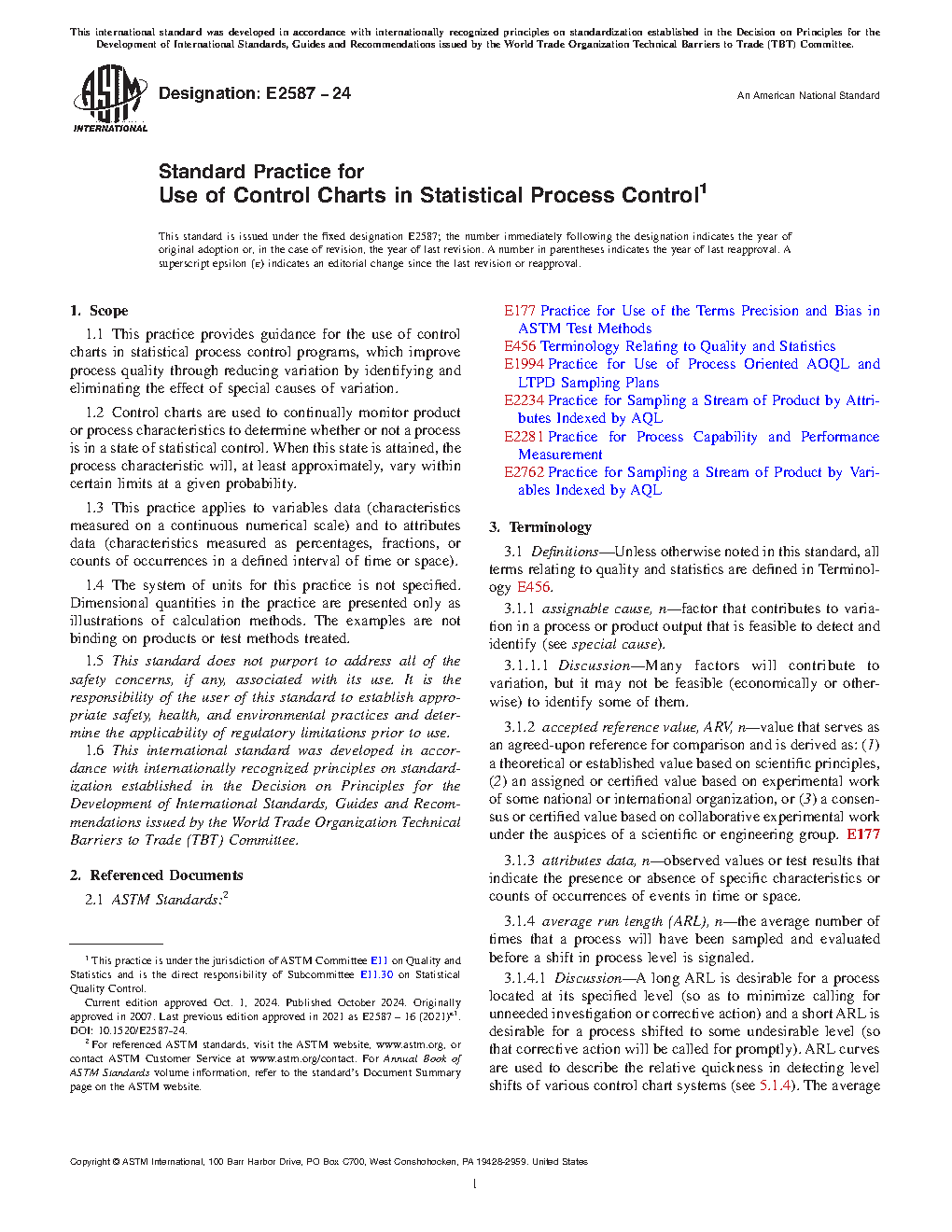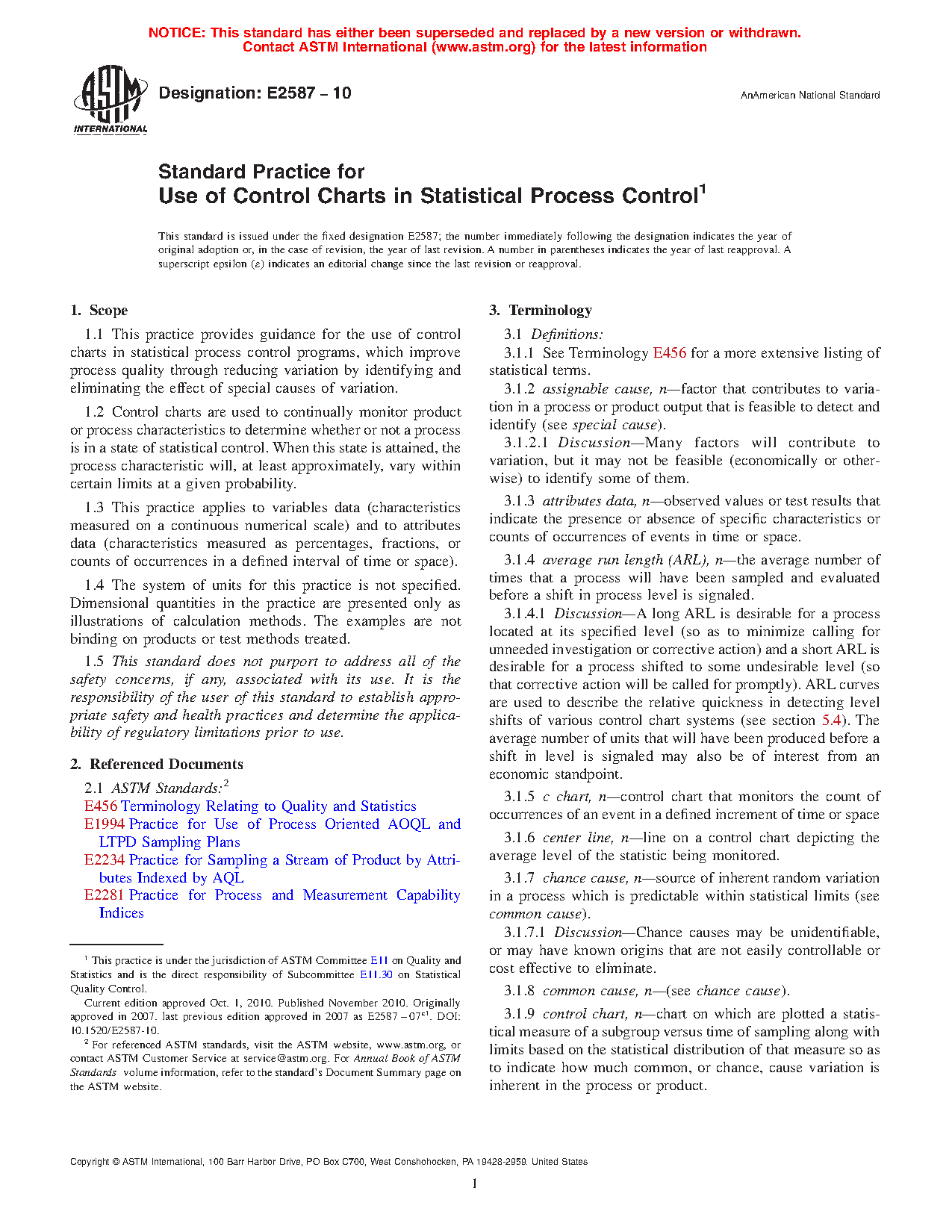 1.1 This practice provides guidance for the use of control charts in statistical process control programs, which improve process quality through reducing variation by identifying and eliminating the effect of special causes of variation.