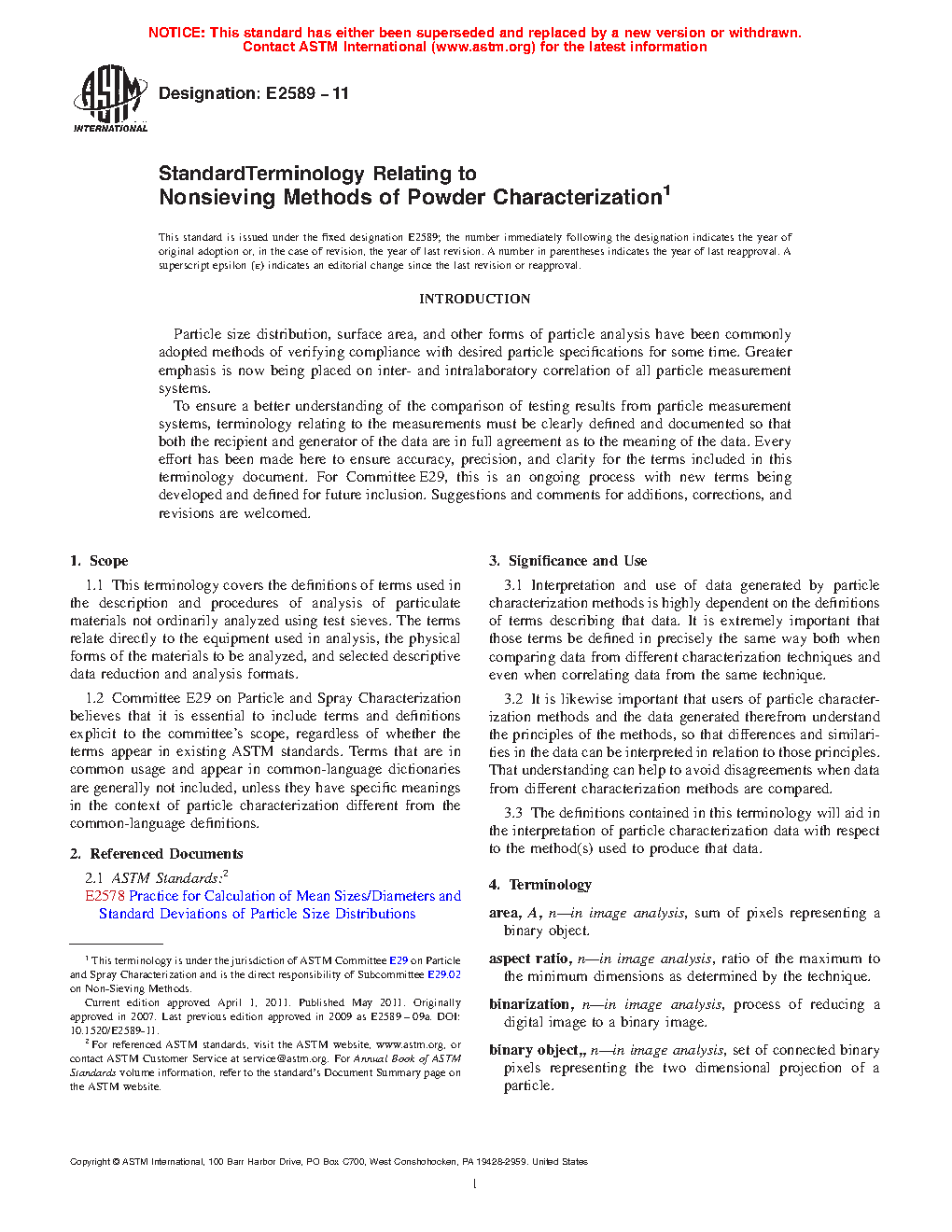 1.2 Committee E29 on Particle and Spray Characterization believes that it is essential to include terms and definitions explicit to the committee’s scope, regardless of whether the terms appear in existing ASTM standards. Terms that are in common usage and appear in common-language dictionaries are generally not included, unless they have specific meanings in the context of particle characterization different from the common-language definitions.