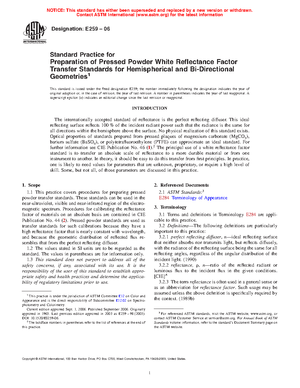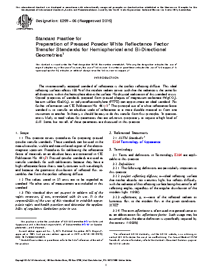 1.1 This practice covers procedures for preparing pressed powder transfer standards. These standards can be used in the near-ultraviolet, visible and near-infrared region of the electromagnetic spectrum. Procedures for calibrating the reflectance factor of materials on an absolute basis are contained in CIE Publication No. 44