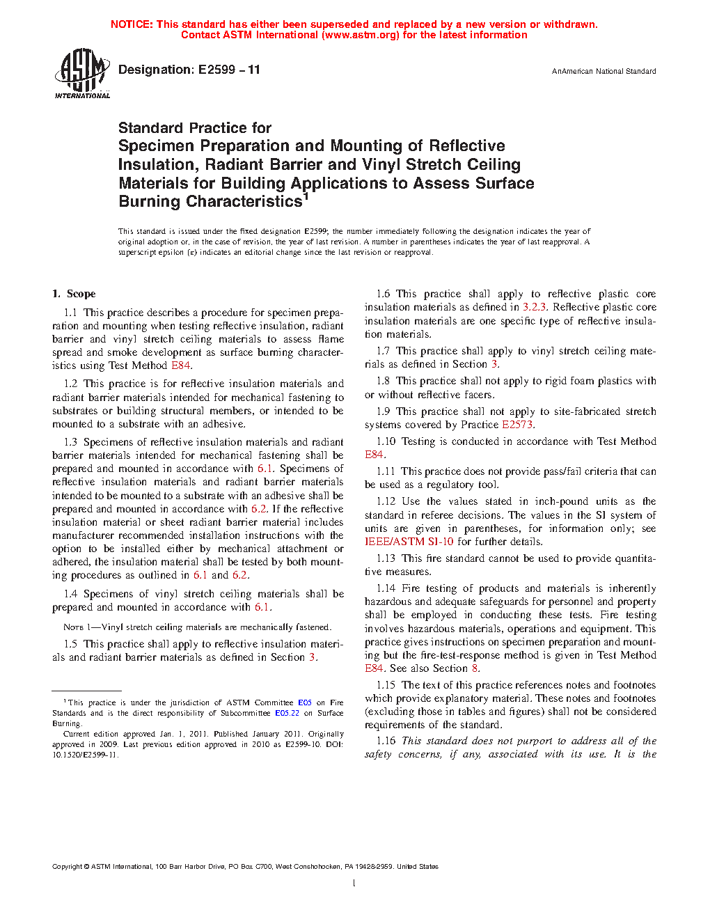 1.1 This practice describes a procedure for specimen preparation and mounting when testing reflective insulation, radiant barrier and vinyl stretch ceiling materials to assess flame spread and smoke development as surface burning characteristics using Test Method E84.
