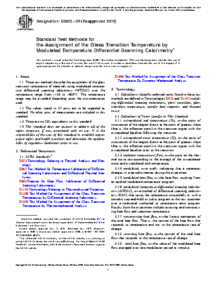 1.1 These test methods describe the assignment of the glass transition temperature of materials using modulated temperature differential scanning calorimetry (MT-DSC) over the temperature range from –120 °C to +600 °C. The temperature range may be extended depending upon the instrumentation used.