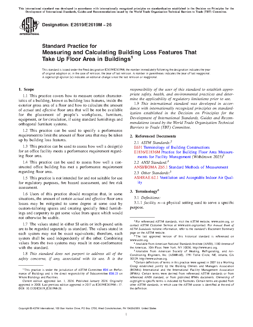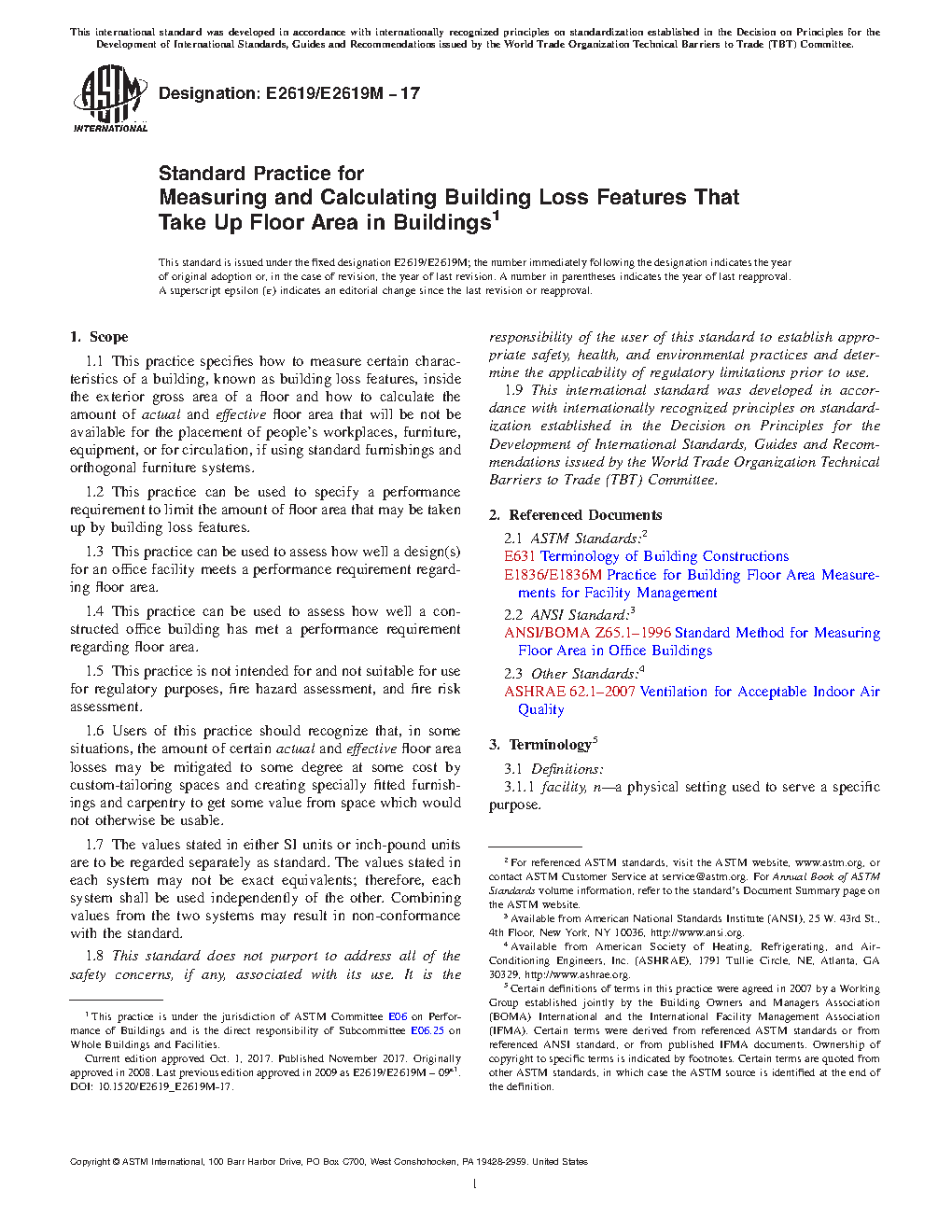 1.1 This practice specifies how to measure certain characteristics of a building, known as building loss features, inside the exterior gross area of a floor and how to calculate the amount of actual and effective floor area that will be not be available for the placement of people’s workplaces, furniture, equipment, or for circulation, if using standard furnishings and orthogonal furniture systems.