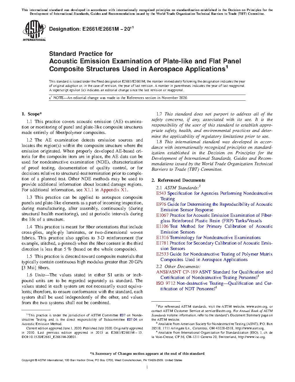 1.3 This practice can be applied to aerospace composite panels and plate-like elements as a part of incoming inspection, during manufacturing, after assembly, continuously (during structural health monitoring) and at periodic intervals during the life of a structure.