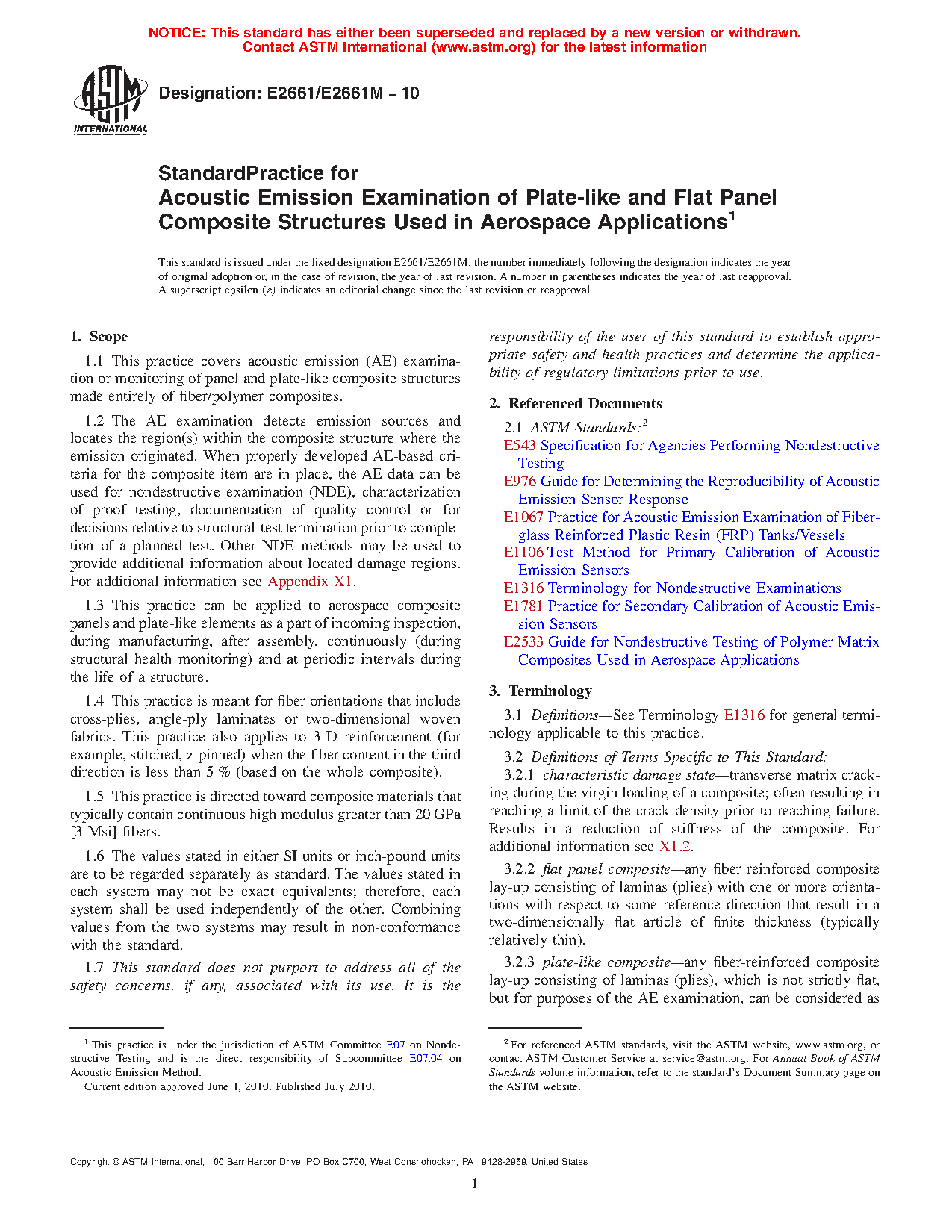 1.2 The AE examination detects emission sources and locates the region(s) within the composite structure where the emission originated. When properly developed AE-based criteria for the composite item are in place, the AE data can be used for nondestructive examination (NDE), characterization of proof testing, documentation of quality control or for decisions relative to structural-test termination prior to completion of a planned test. Other NDE methods may be used to provide additional information about located damage regions. For additional information see X1.1 in Appendix X1.