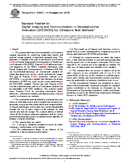 1.1 This practice facilitates the interoperability of ultrasonic imaging equipment by specifying image data transfer and archival storage methods in commonly accepted terms. This document is intended to be used in conjunction with Practice E2339 on Digital Imaging and Communication in Nondestructive Evaluation (DICONDE). Practice E2339 defines an industrial adaptation of the NEMA Standards Publication titled Digital Imaging and Communications in Medicine (DICOM, see http://medical.nema.org), an international standard for image data acquisition, review, transfer and archival storage. The goal of Practice E2339, commonly referred to as DICONDE, is to provide a standard that facilitates the display and analysis of NDE test results on any system conforming to the DICONDE standard. Toward that end, Practice E2339 provides a data dictionary and set of information modules that are applicable to all NDE modalities. This practice supplements Practice E2339 by providing information object definitions, information modules and data dictionary that are specific to ultrasonic test methods.