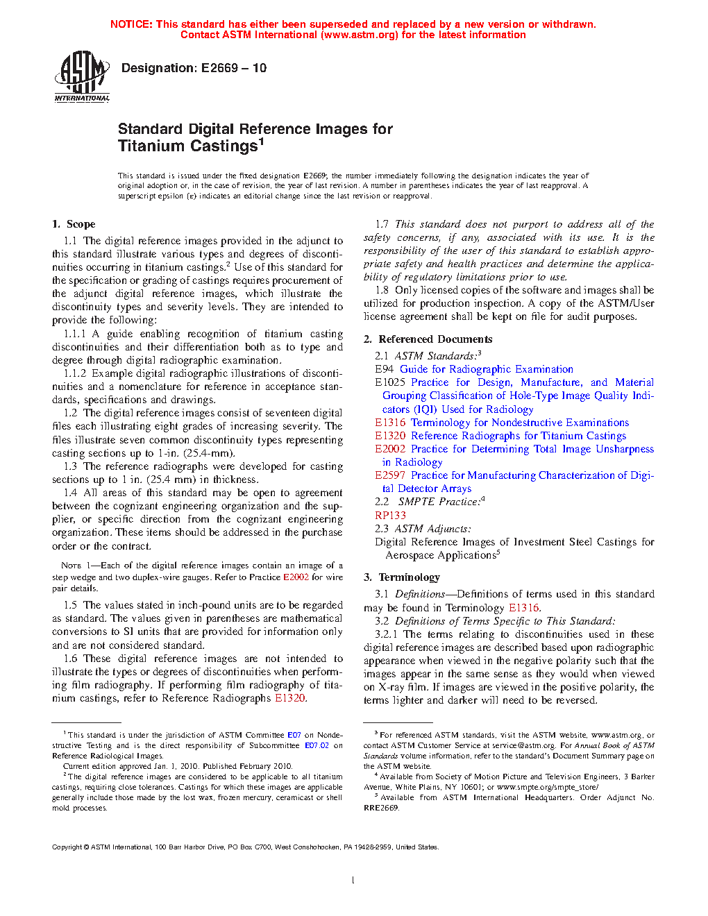 1.5 These digital reference images are not intended to illustrate the types or degrees of discontinuities when performing film radiography. If performing film radiography of titanium castings, refer to Reference Radiographs E1320.