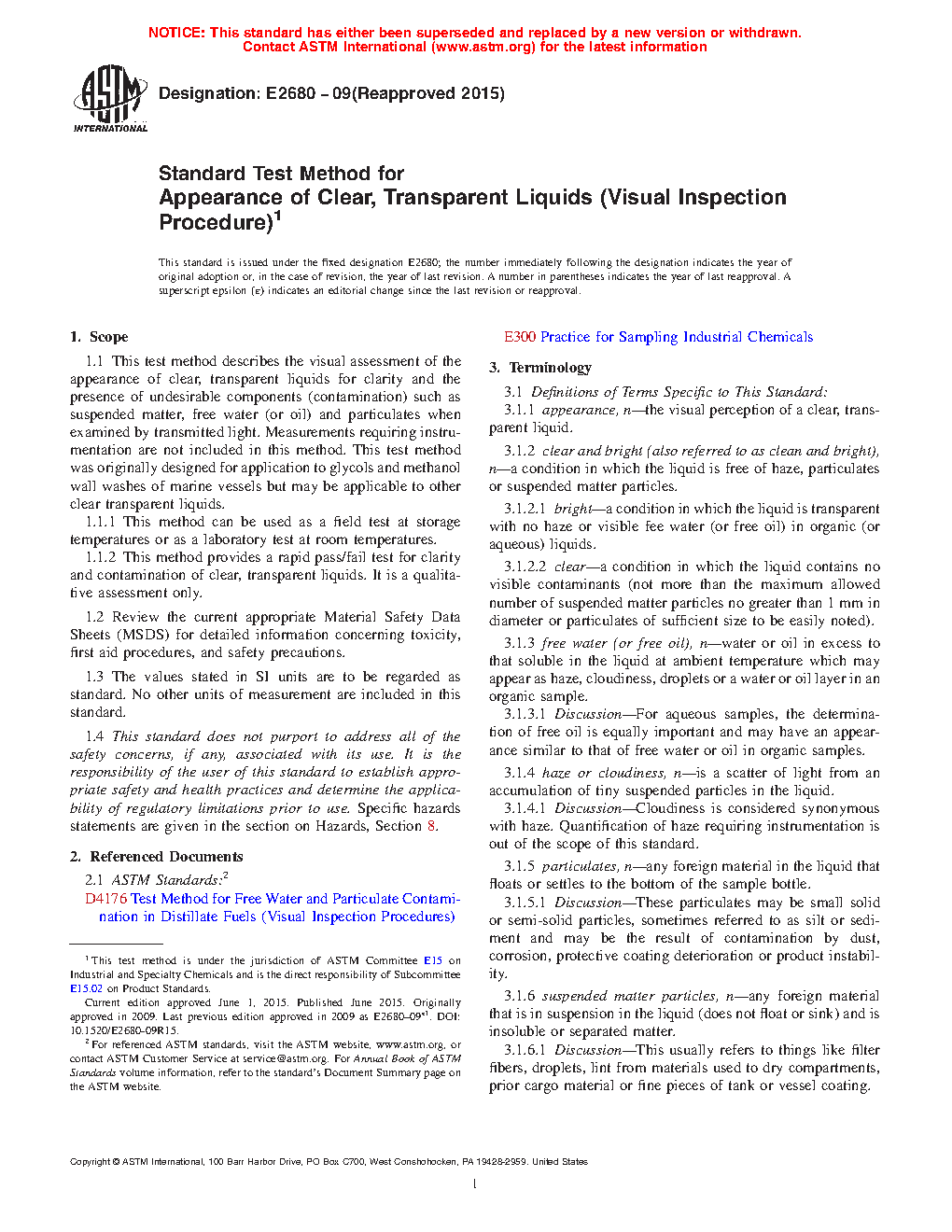 1.1 This test method describes the visual assessment of the appearance of clear, transparent liquids for clarity and the presence of undesirable components (contamination) such as suspended matter, free water (or oil) and particulates when examined by transmitted light. Measurements requiring instrumentation are not included in this method. This test method was originally designed for application to glycols and methanol wall washes of marine vessels but may be applicable to other clear transparent liquids.