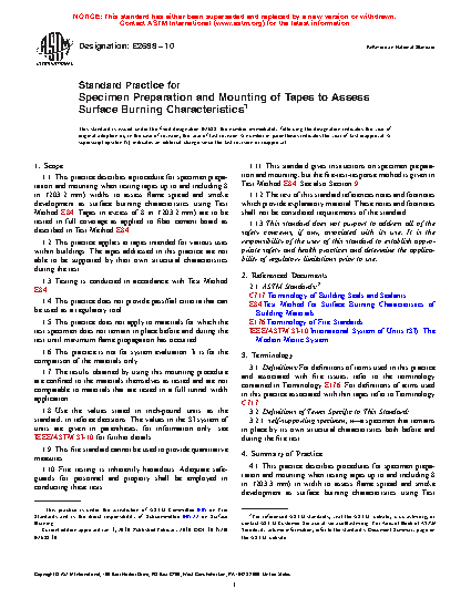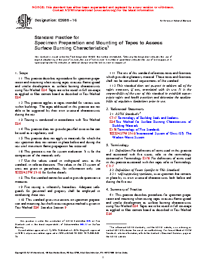 5.2 Codes are often silent with regard to testing tapes for the assessment of flame spread and smoke development as surface burning characteristics. This practice describes specimen preparation and mounting procedures for such materials and products.