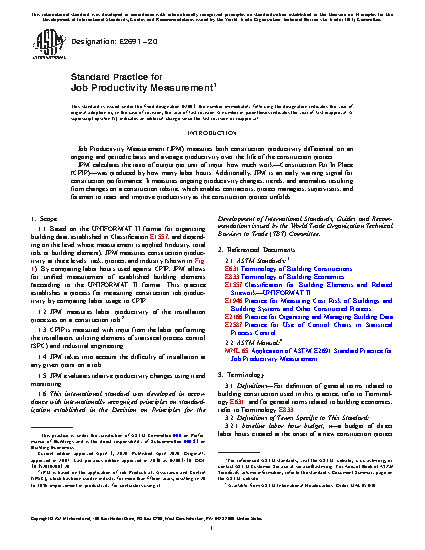 1.1 Based on the UNIFORMAT II format for organizing building data, established in Classification E1557, and depending on the level where measurement is applied (industry, total job, or building element), JPM measures construction productivity at three levels: task, project, and industry (shown in Fig. 1). By comparing labor hours used against CPIP, JPM allows for unified measurement of established building elements (according to the UNIFORMAT II format. This practice establishes a process for measuring construction job productivity by comparing labor usage to CPIP.