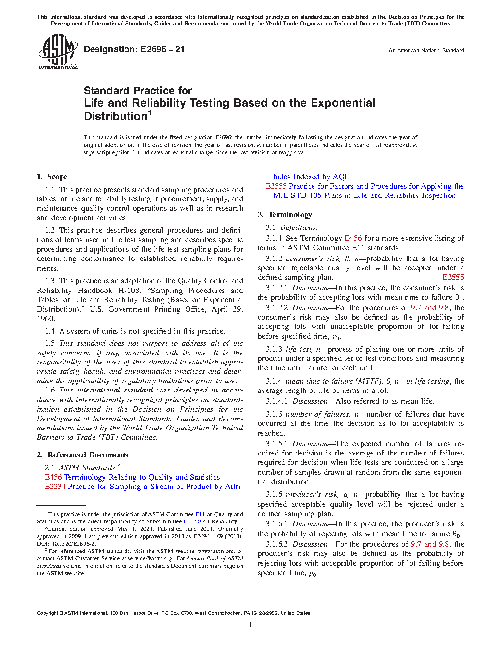 1.3 This practice is an adaptation of the Quality Control and Reliability Handbook H-108, “Sampling Procedures and Tables for Life and Reliability Testing (Based on Exponential Distribution),” U.S. Government Printing Office, April 29, 1960.