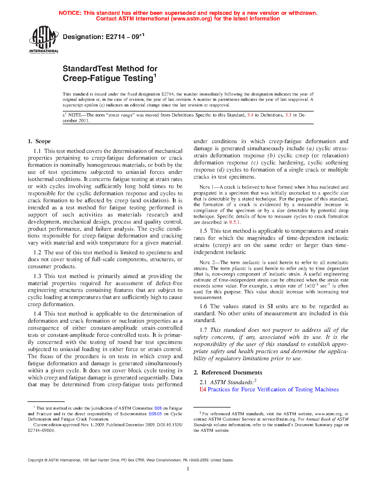 1.3 This test method is primarily aimed at providing the material properties required for assessment of defect-free engineering structures containing features that are subject to cyclic loading at temperatures that are sufficiently high to cause creep deformation.