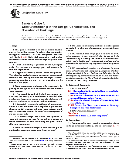 4.4 The building industry diverts an estimated 16 percent of global fresh water annually (3). It is imperative that design and construction address water efficiency. The estimate of annual usage of available fresh water by the building industry accounts for the quantity of water that is required to manufacture building materials and to construct and operate buildings. It does not reflect the impact of the building industry on the quality of water.