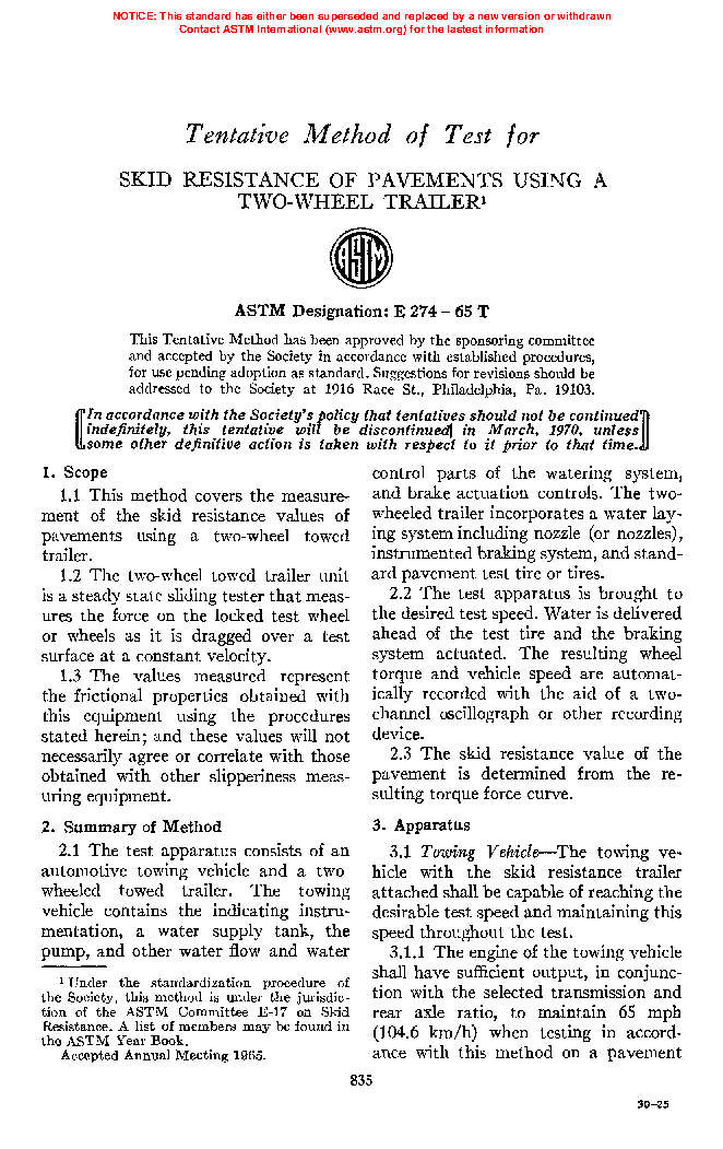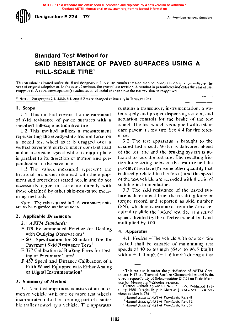 This test method establishes the standard procedure for measuring the skid resistance of paved surfaces by the use of a specified full-scale automotive tire. This test method utilizes a measurement representing the steady-state friction force on a locked test wheel as it is dragged over a wetted pavement surface under constant load and at a constant speed while its major plane is parallel to its direction of motion and perpendicular to the pavement. The values measured represent the frictional properties obtained with the equipment and procedures stated herein. These values are intended for use in evaluating the skid resistance of a pavement relative to that of other pavements or for evaluating changes in the skid resistance of a pavement with the passage of time. They are, however, insufficient to determine the distance required to stop a vehicle on either a wet or a dry pavement. They are also insufficient for determining the speed at which control of a vehicle would be lost, because peak and side force friction are also required for these determinations. The apparatus required for this method are a vehicle with suitable test wheels (including tire and rim) and braking system, wheel load, force-measuring transducer, torque-measuring transducer, vehicle speed-measuring transducer, signal conditioning and recorder system, and pavement wetting system.