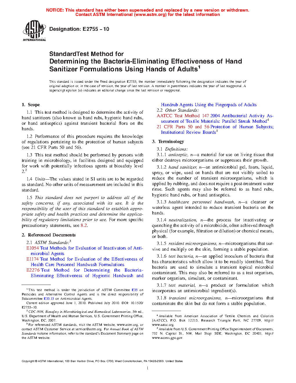 5.6 This test method may be used as an alternative to Test Method E2276, which limits the test bacteria to the fingerpads and does not incorporate actual use conditions such as friction during hand rubbing.