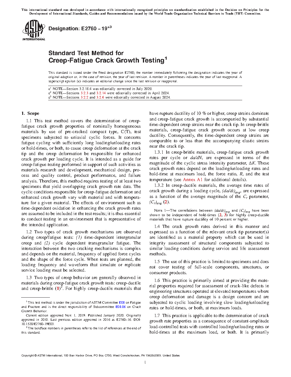 1.8 This practice is applicable to temperatures and hold-times for which the magnitudes of time-dependent inelastic strains at the crack tip are significant in comparison to the time-independent inelastic strains. No restrictions are placed on environmental factors such as temperature, pressure, humidity, medium and others, provided they are controlled throughout the test and are detailed in the data report.