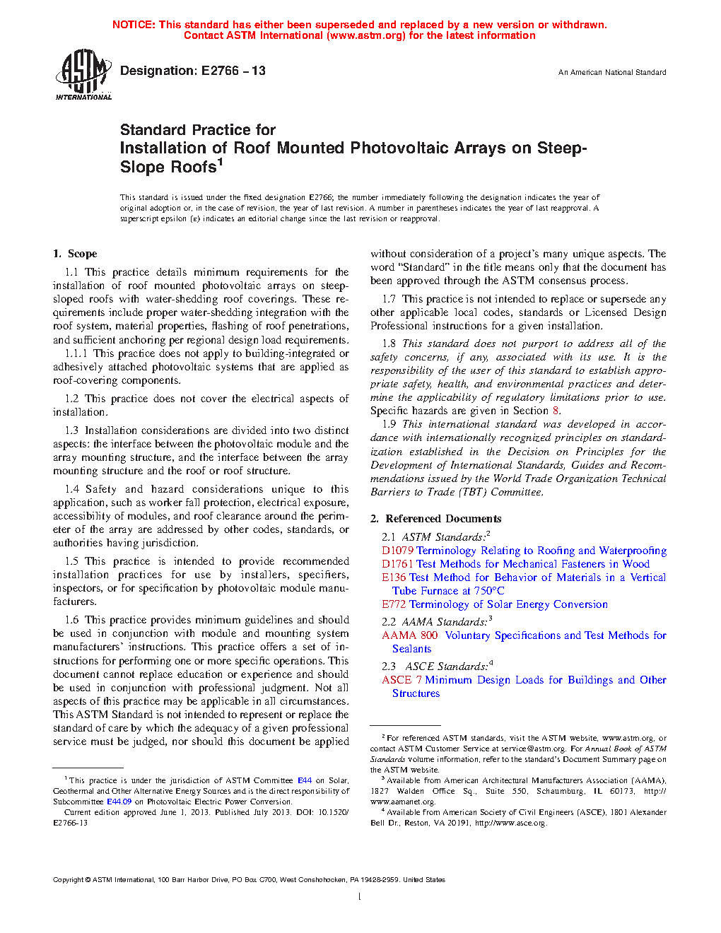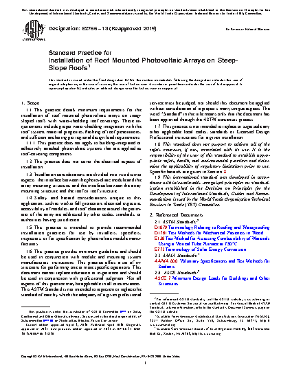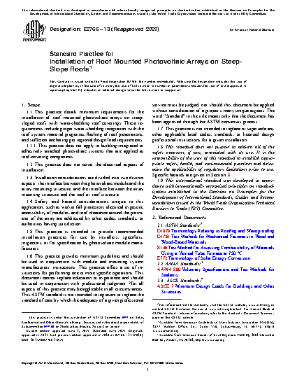 1.1 This practice details minimum requirements for the installation of roof mounted photovoltaic arrays on steep-sloped roofs with water-shedding roof coverings. These requirements include proper water-shedding integration with the roof system, material properties, flashing of roof penetrations, and sufficient anchoring per regional design load requirements.