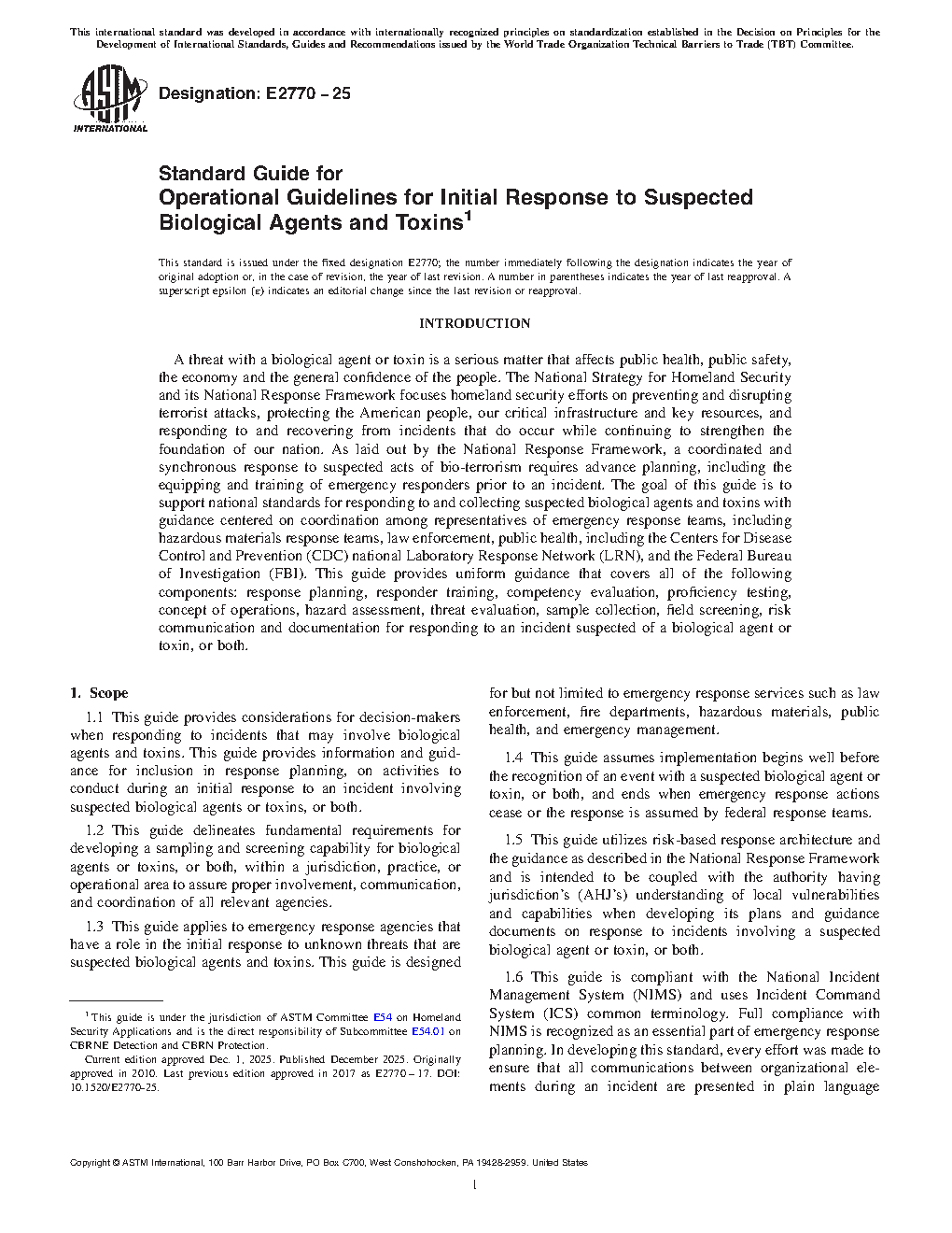 1.5 This guide utilizes risk-based response architecture and the guidance as described in the National Response Framework and is intended to be coupled with the authority having jurisdiction’s (AHJ’s) understanding of local vulnerabilities and capabilities when developing its plans and guidance documents on response to incidents involving a suspected biological agent or toxin, or both.
