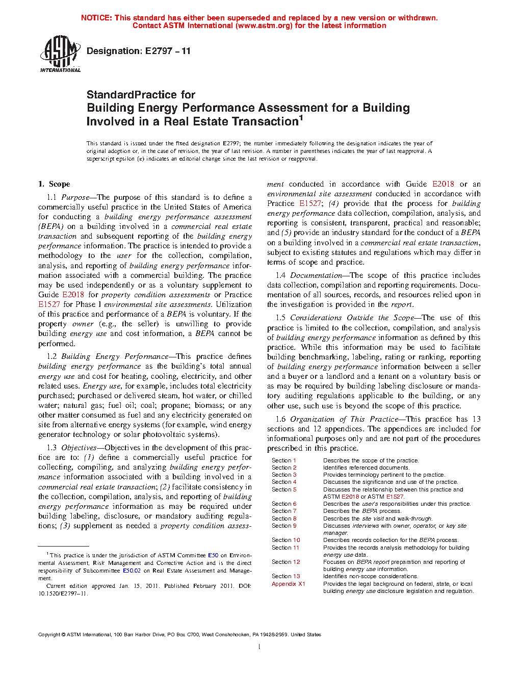 1.1 Purpose—The purpose of this standard is to define a commercially useful practice in the United States of America for conducting a building energy performance assessment (BEPA) on a building involved in a commercial real estate transaction and subsequent reporting of the building energy performance information. The practice is intended to provide a methodology to the user for the collection, compilation, analysis, and reporting of building energy performance information associated with a commercial building. The practice may be used independently or as a voluntary supplement to Guide E2018 for property condition assessments or Practice E1527 for Phase I environmental site assessments. Utilization of this practice and performance of a BEPA is voluntary. If the property owner (e.g., the seller) is unwilling or unable to provide building energy use and cost information, a BEPA cannot be performed.