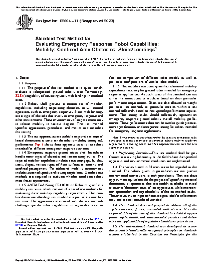 1.1.1 The purpose of this test method is to quantitatively evaluate a teleoperated ground robot’s (see Terminology E2521) capability of traversing stairs with landings in confined areas.
