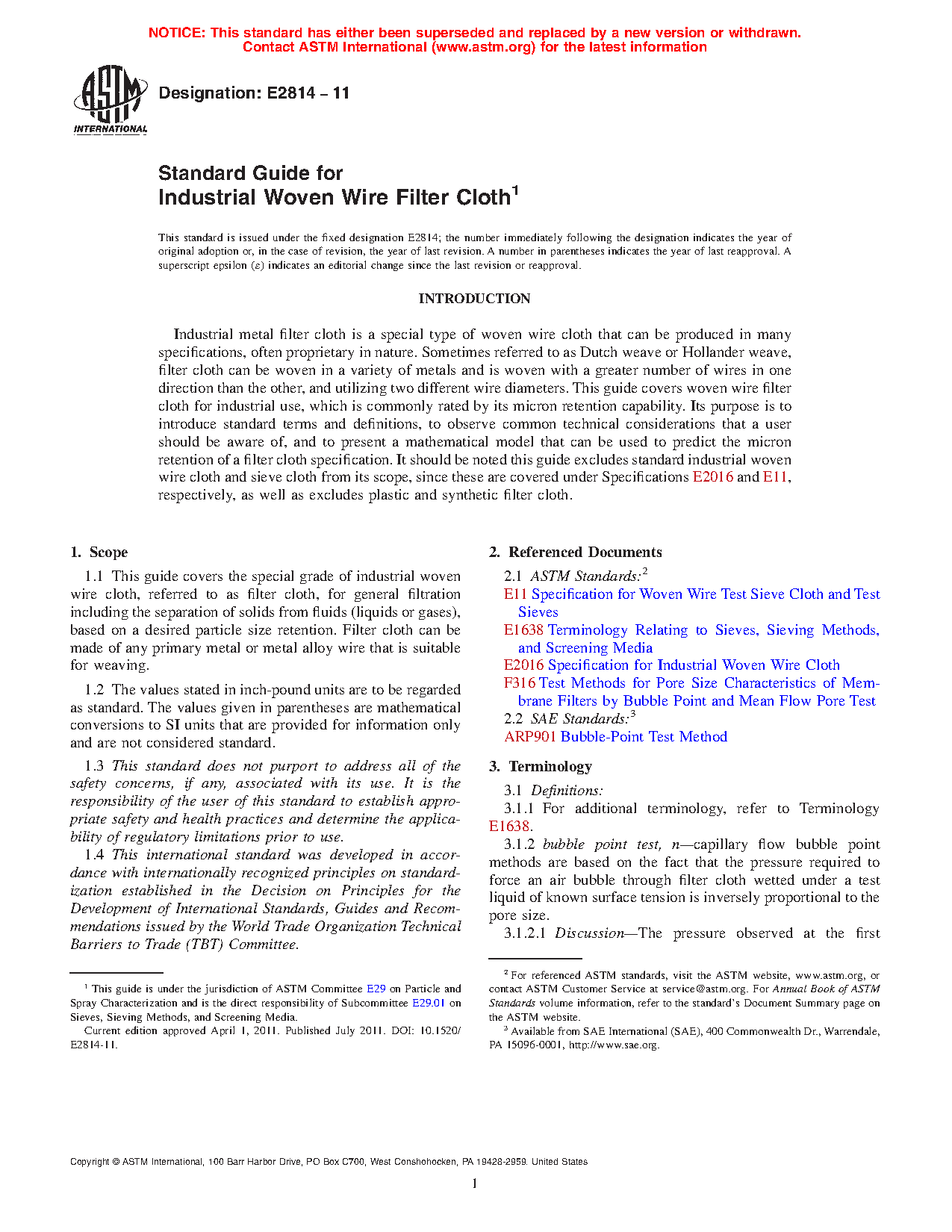 1.1 This specification covers the special grade of industrial woven wire cloth, referred to as filter cloth, for general filtration including the separation of solids from fluids (liquids or gases), based on a desired particle size retention. Filter cloth can be made of any primary metal or metal alloy wire that is suitable for weaving.
