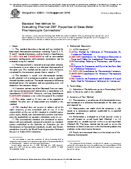 1.1 This standard describes a thermal emf test method for base-metal thermocouple connectors including Types E, J, K, N and T. Standard connectors such as found in Specifications E1129/E1129M and E1684 as well as non-standard connector configurations and connector components can be evaluated using this method.