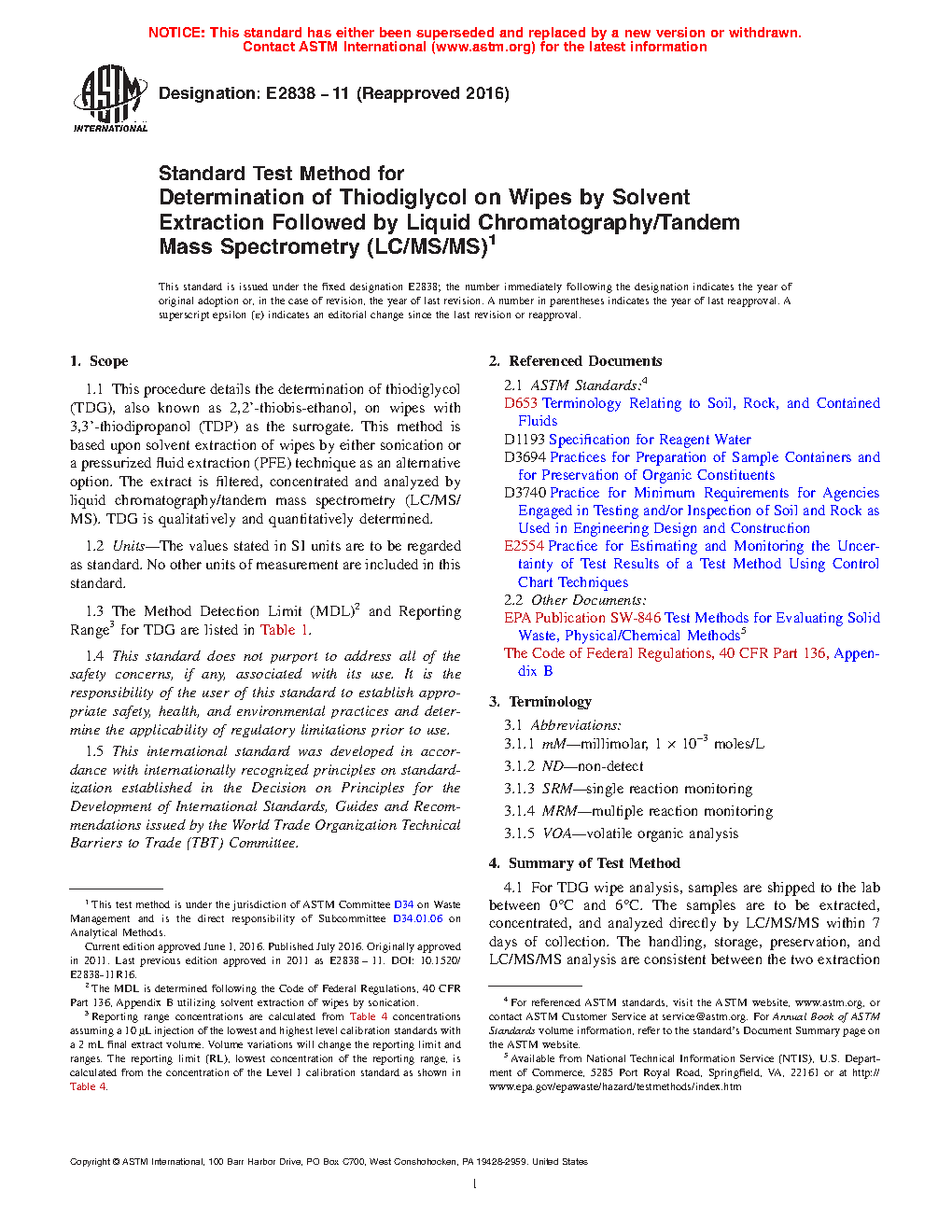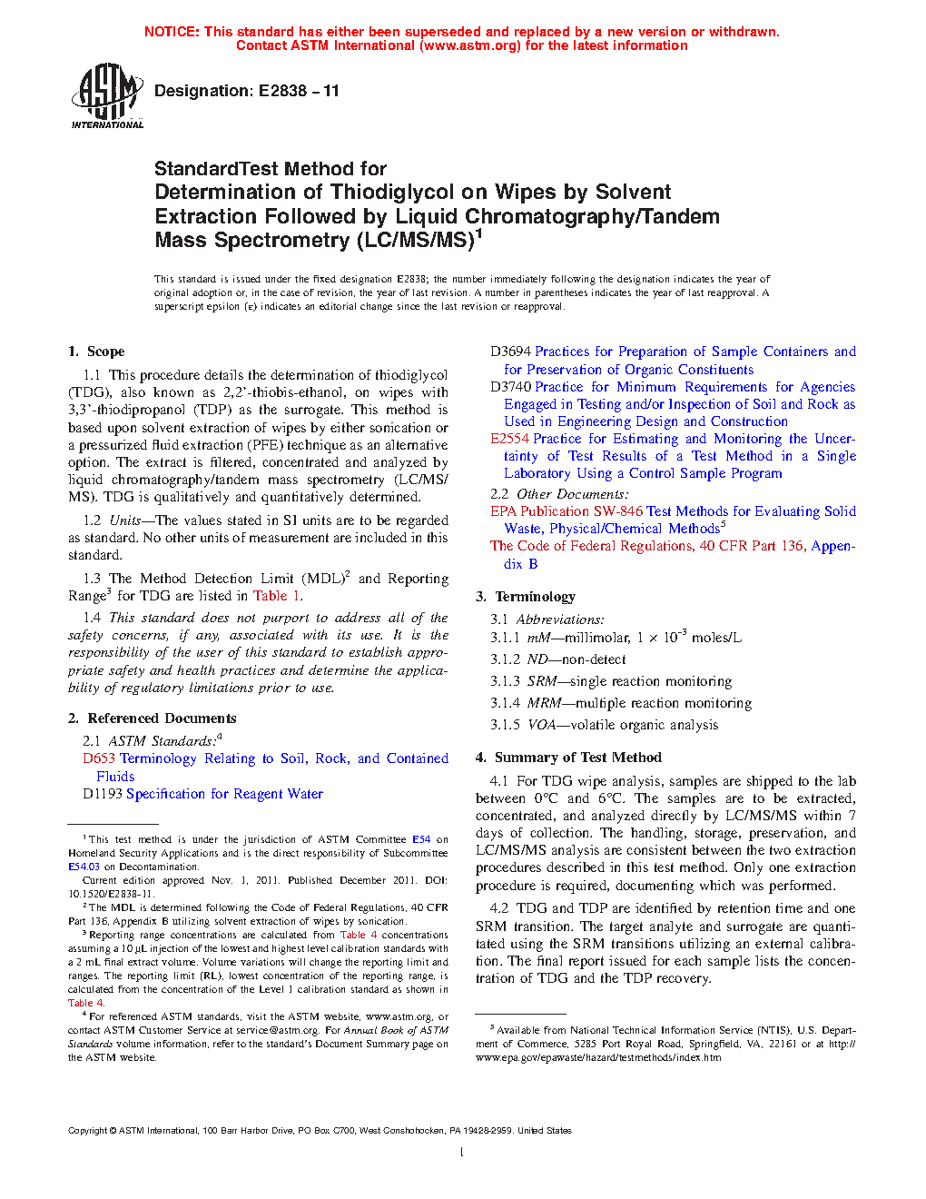 1.1 This procedure details the determination of thiodiglycol (TDG), also known as 2,2’-thiobis-ethanol, on wipes with 3,3’-thiodipropanol (TDP) as the surrogate. This method is based upon solvent extraction of wipes by either sonication or a pressurized fluid extraction (PFE) technique as an alternative option. The extract is filtered, concentrated, and analyzed by liquid chromatography/tandem mass spectrometry (LC/MS/MS). TDG is qualitatively and quantitatively determined.